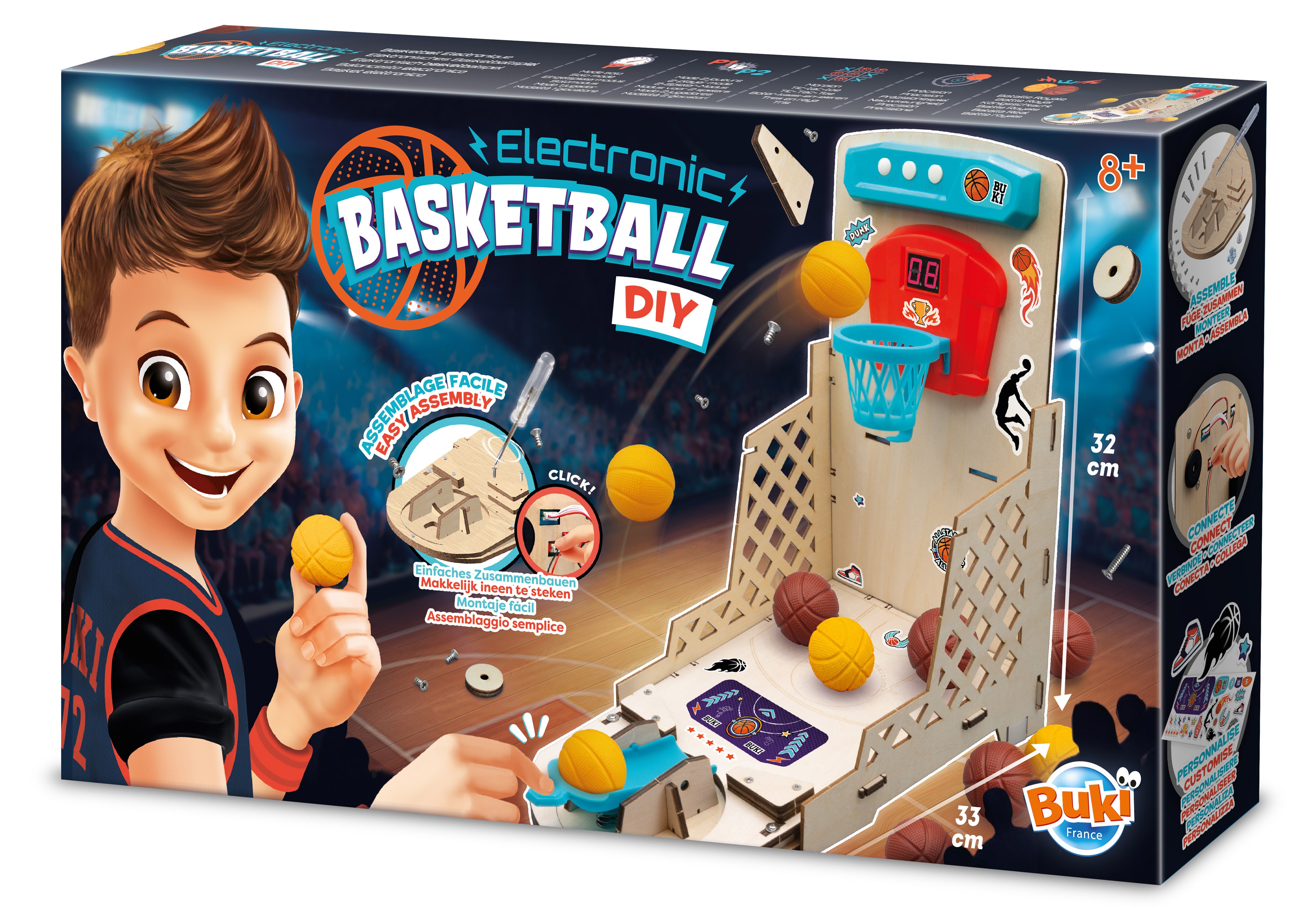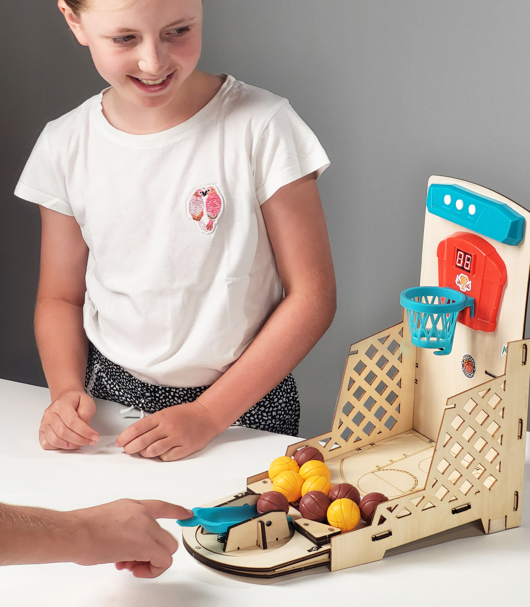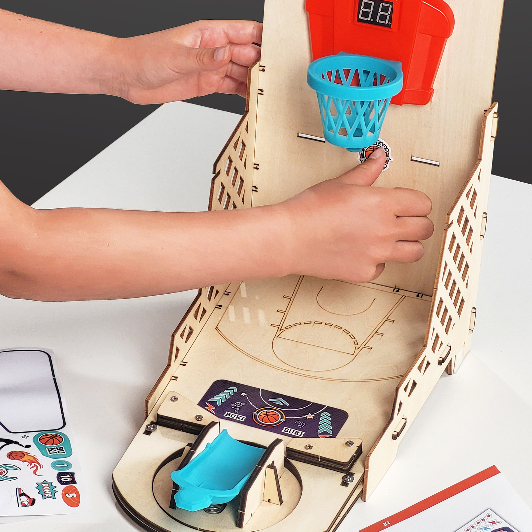 Zestaw do zbudowania elektronicznego mini boiska do koszykówki. Za pomocą załączonego śrubokrętu dzieci mogą bezpiecznie przymocować tablicę wyników, pulpit sterowniczy, głośnik i przegródkę na baterie. Wszystkie części łączą się ze sobą bez użycia kleju.
