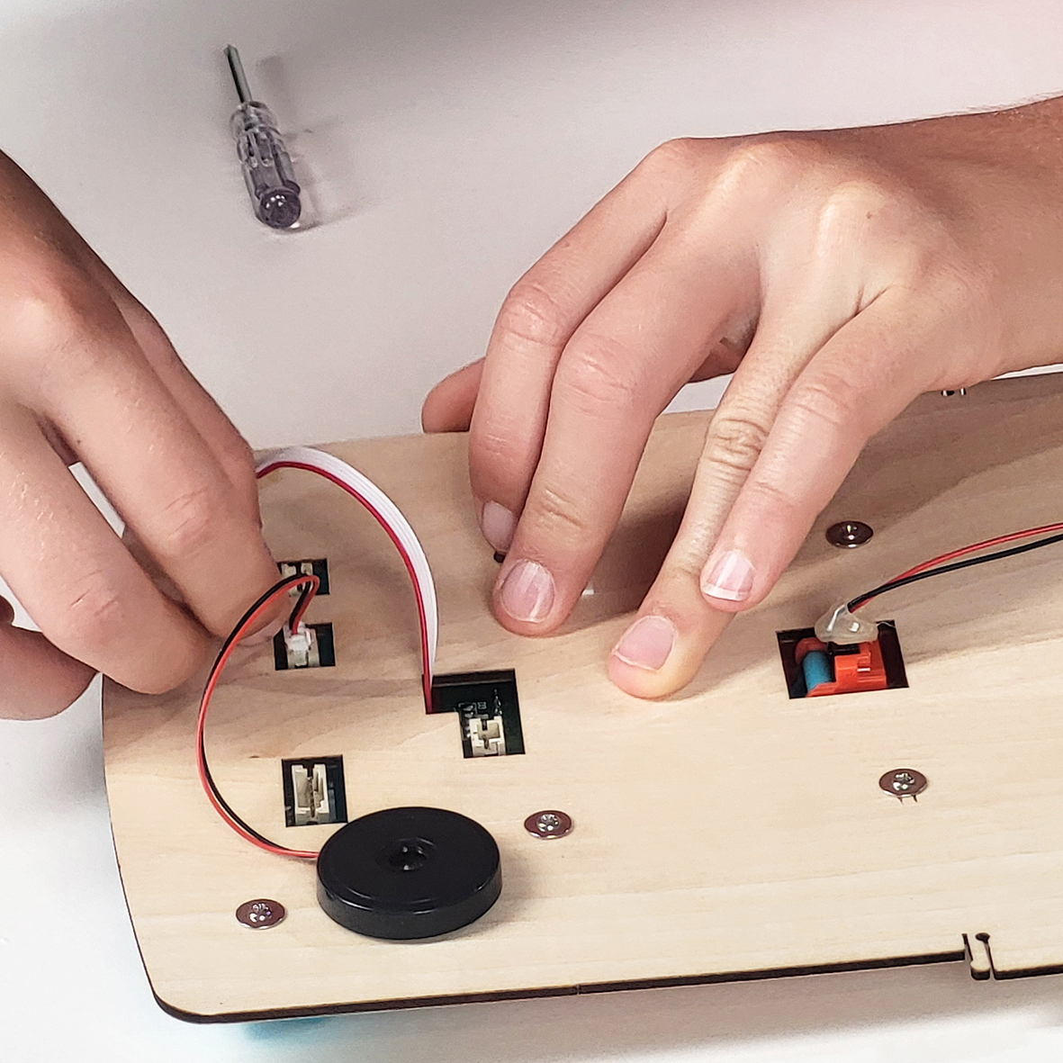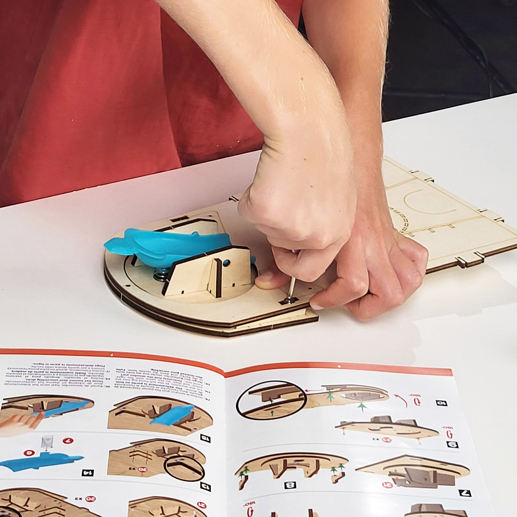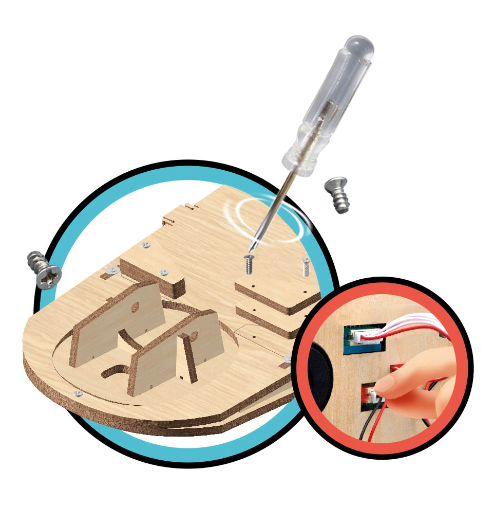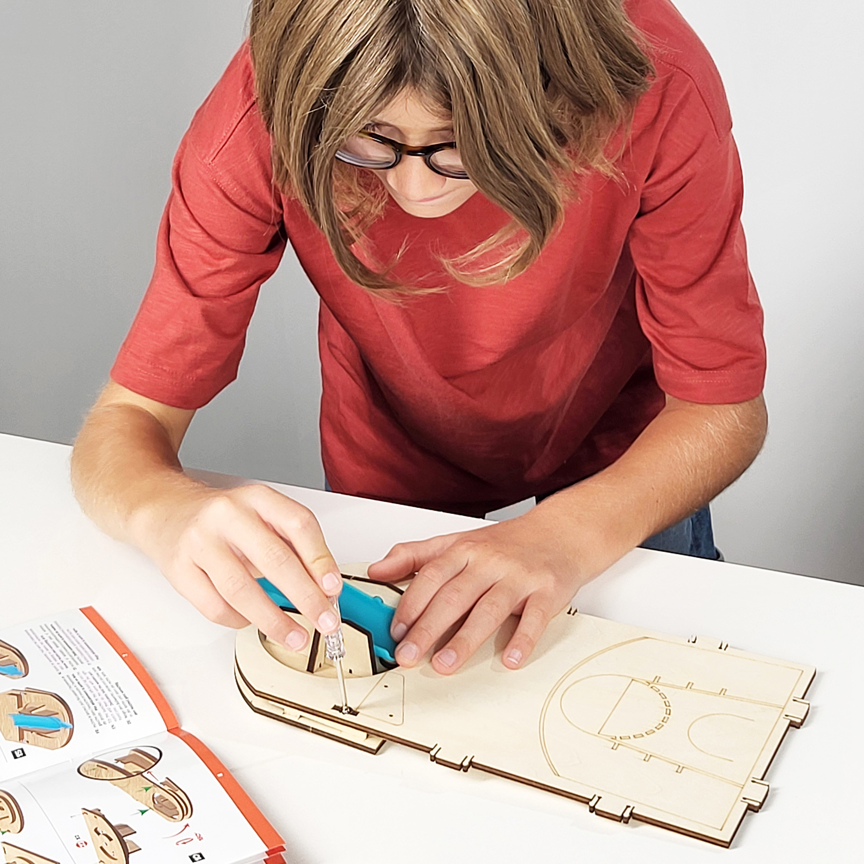 Zestaw do zbudowania elektronicznego mini boiska do koszykówki. Za pomocą załączonego śrubokrętu dzieci mogą bezpiecznie przymocować tablicę wyników, pulpit sterowniczy, głośnik i przegródkę na baterie. Wszystkie części łączą się ze sobą bez użycia kleju.