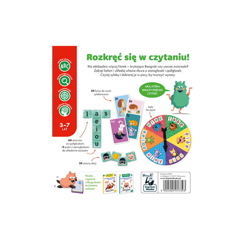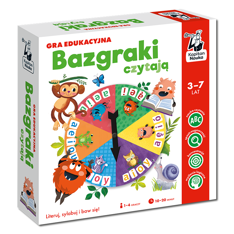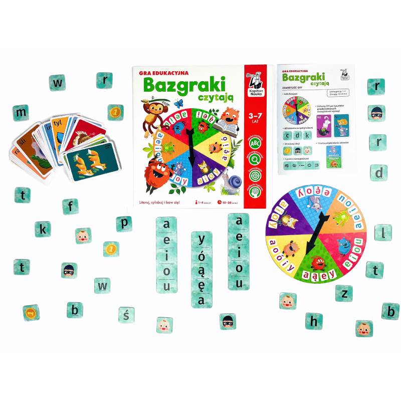 Bazgraki czytają. Gra edukacyjna to gra do nauki czytania, która może stanowić uzupełnienie zestawu ćwiczeń i elementarzy z naklejkami do nauki czytania metodą sylabową z uwielbianej przez dzieci serii Kapitana Nauki z Bazgrakami. Dzięki dwóm wariantom rozgrywek dzieci mogą doskonalić czytanie zarówno metodą sylabową, jak i literową. Za sprawą rozrywkowej formuły gry dzieci z łatwością utrwalają poznane wcześniej literki czy sylaby. Na graczy czekają ponadto czytelnicze wyzwania o różnym stopniu trudności, dzięki czemu gra posłuży przez dłuższy czas.