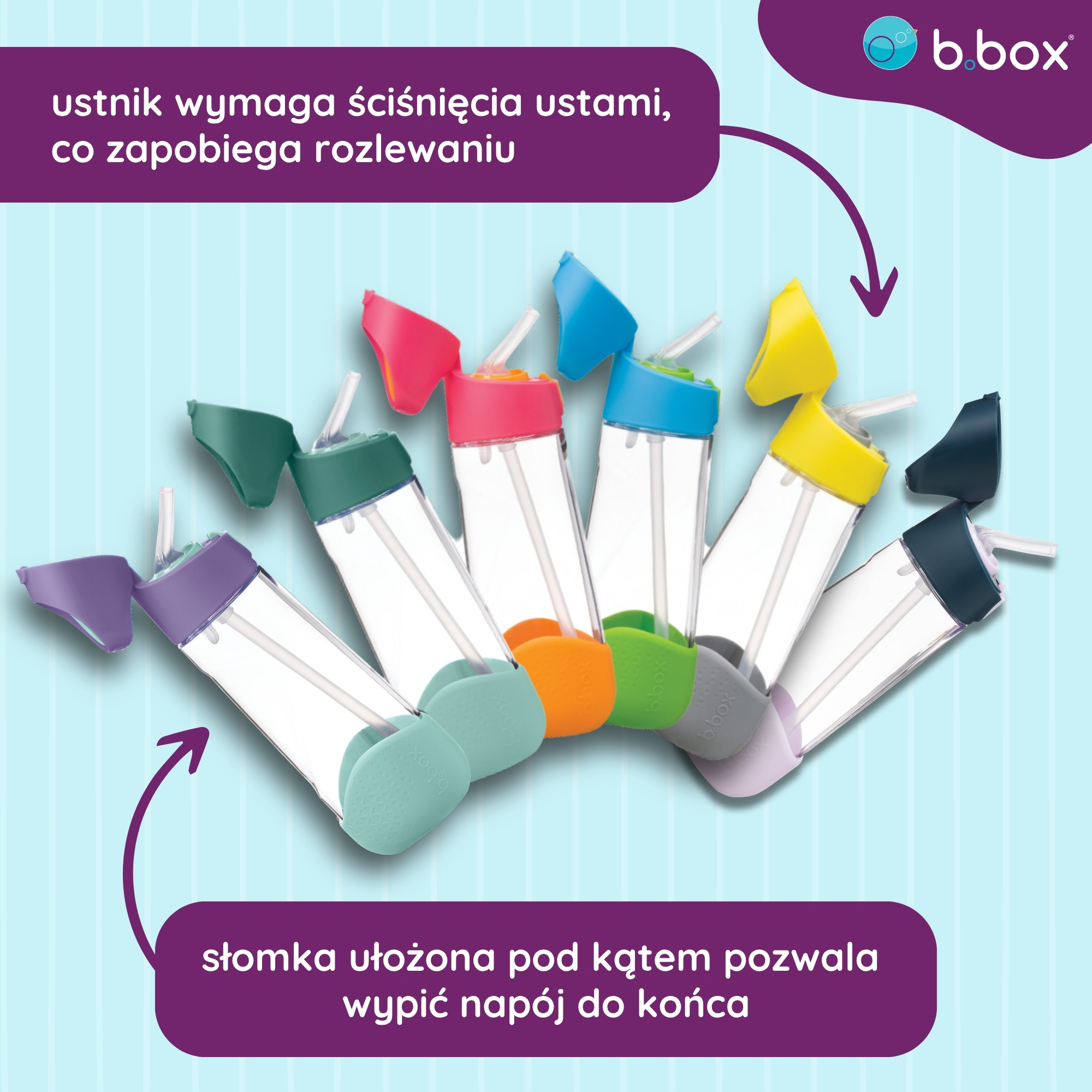 Tritanowa butelka B.box ze słomką to australijska jakość i niezawodność. Idealna butelka dla dzieci do szkoły i przedszkola, na wycieczki i wyjazdy. Tritan jest dobrą alternatywą szkodliwego plastiku i nie tłucze się jak szkło. Trwały materiał, wolny od Bpa i innych szkodliwych substancji jakie uwalnia plastikowa butelka. Trójkątny kształt butelki na wodę jest łatwy w trzymaniu, słomka usadowiona pod kątem daje możliwość wypicia wody do końca, jest wymienna. Butelka B.box jest wyposażona w system łatwego, szybkiego otwierania na przycisk, szczelna nakrętka zabezpiecza przed rozlaniem i przeciekaniem, uchwyt umożliwia trzymanie butelki w ręce lub przypięcie do paska. Na spodzie antypoślizgowy silikon.