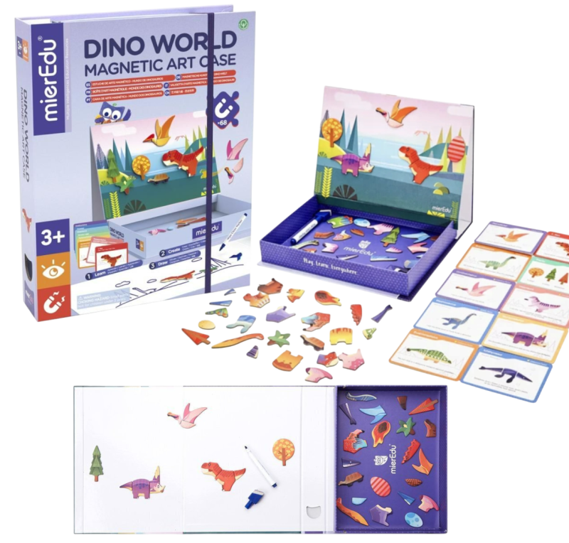 Magnetyczna układanka „Świat Dinozaurów” od MierEdu to idealna propozycja dla małych odkrywców i fanów prehistorycznych stworzeń. W poręcznym pudełku znajduje się magnetyczna plansza oraz magnesy przedstawiające różne dinozaury, roślinność i elementy otoczenia. Dziecko może tworzyć własne sceny, odtwarzać jurajski krajobraz lub układać dinozaury zgodnie z kartami z zadaniami (jeśli dołączone), za każdym razem tworząc nową historię.