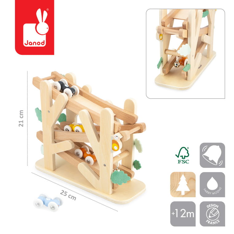 Drewniany kulodrom Mrówki z serii Sweet Cocoon francuskiej marki JANOD to idealna zabawka dla dzieci od 1. roku życia. Zestaw składa się z trzypiętrowej rampy-gałązek, po której można puszczać mrówki-pojazdy, aby toczyły się w dół. Cztery mróweczki w różnych kolorach mają poręczną wielkość i są wygodne do trzymania w małych rączkach. Przy dolnej platformie znajduje się dzwoneczek, którego przyjemny dźwięk informuje, że pojazd dotarł do celu. Zabawka została zaprojektowana we Francji. Zapakowana w estetyczne, kartonowe pudełko. Idealnie nadaje się na prezent.