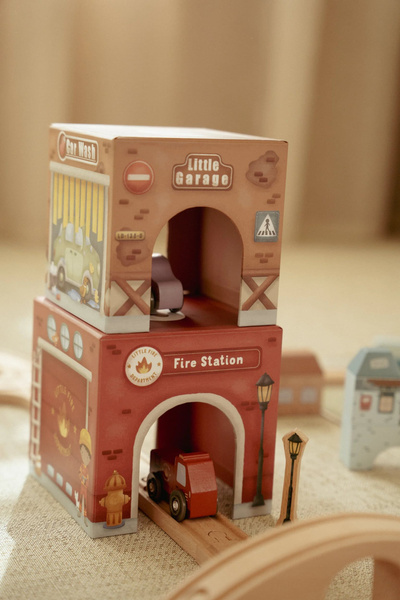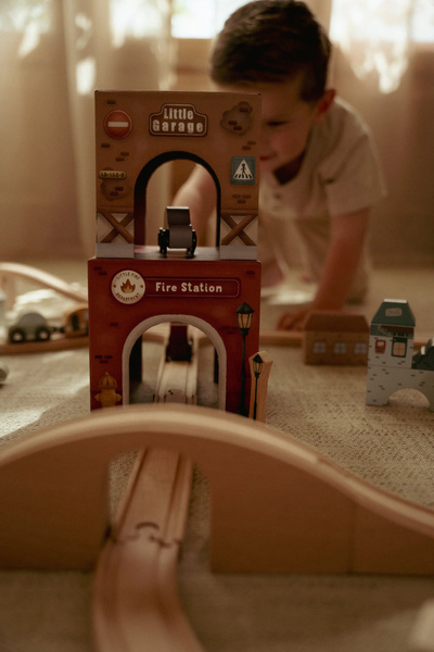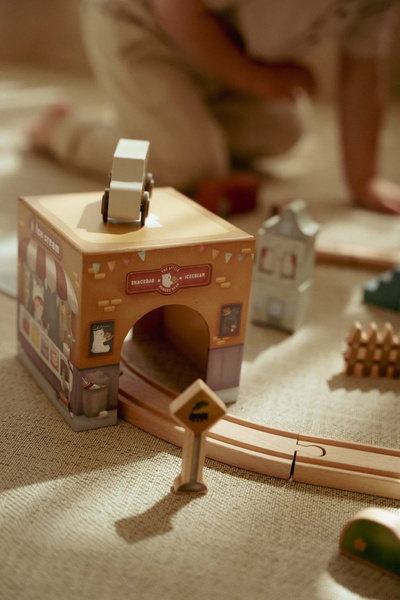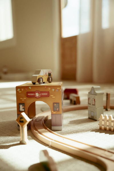 Zabawa w tunel – ustaw klocki na torach kolejki XL Little Dutch i puść pojazdy przez przejazdy.