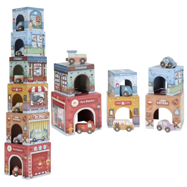 Ćwiczy motorykę małą i koordynację – układanie wieży i dopasowywanie pojazdów.
