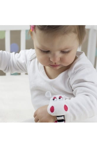 Grzechotka na rączkę Mom's care jest mięciutka, sensoryczna, aktywizuje, bardzo interesuje małe dzieci. Bransoletka niemowlęca jest zapinana na rzep, a główka Żabki przyjemnie grzechocze. Miękka grzechotka może być założona na rącze lub nóżkę niemowlęcia, zachęcając go do ruchu i potrząsania. Grzechotka na rączkę ma bardzo mięciutki pasek, który jest delikatny dla skóry dziecka.