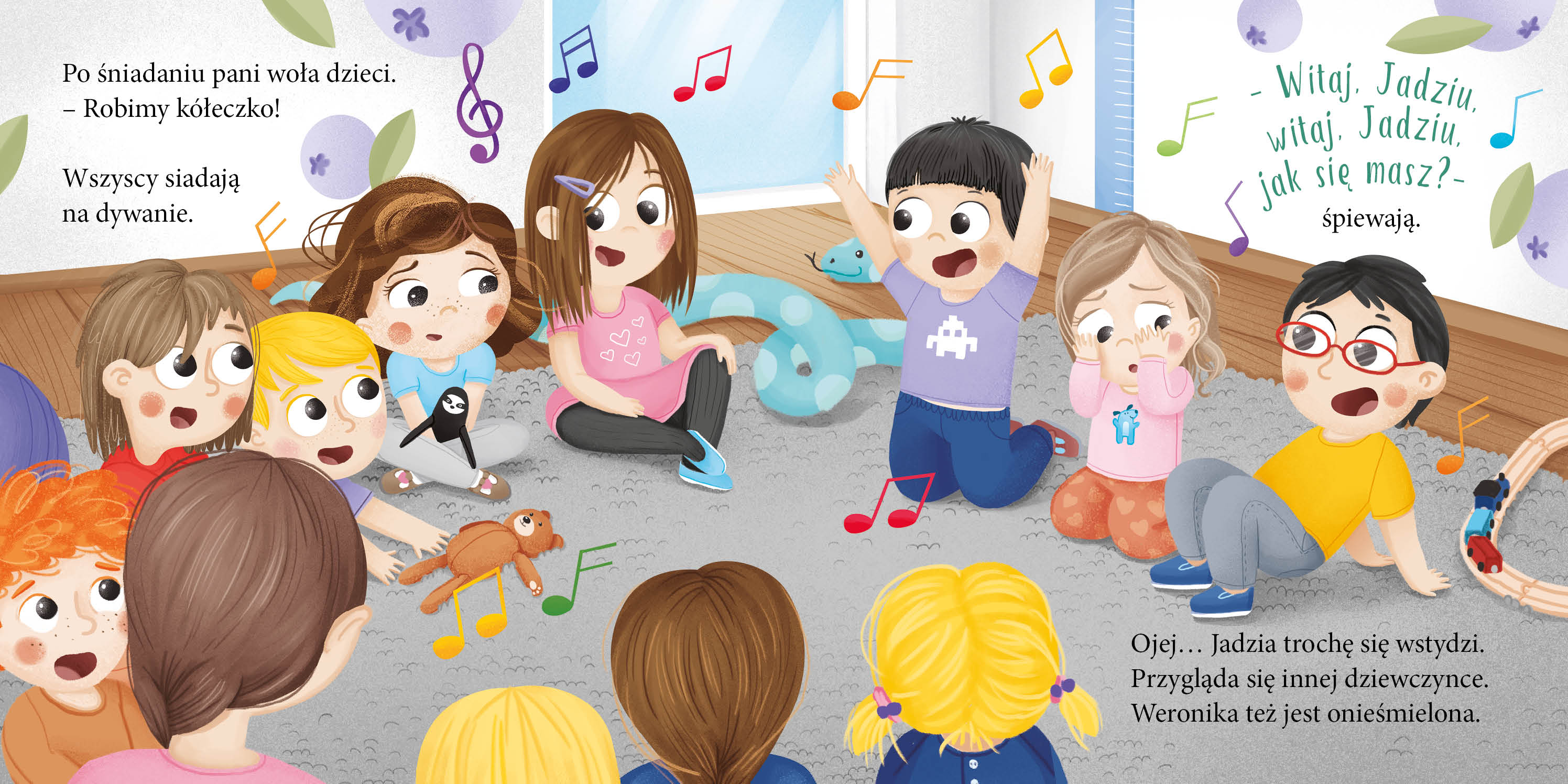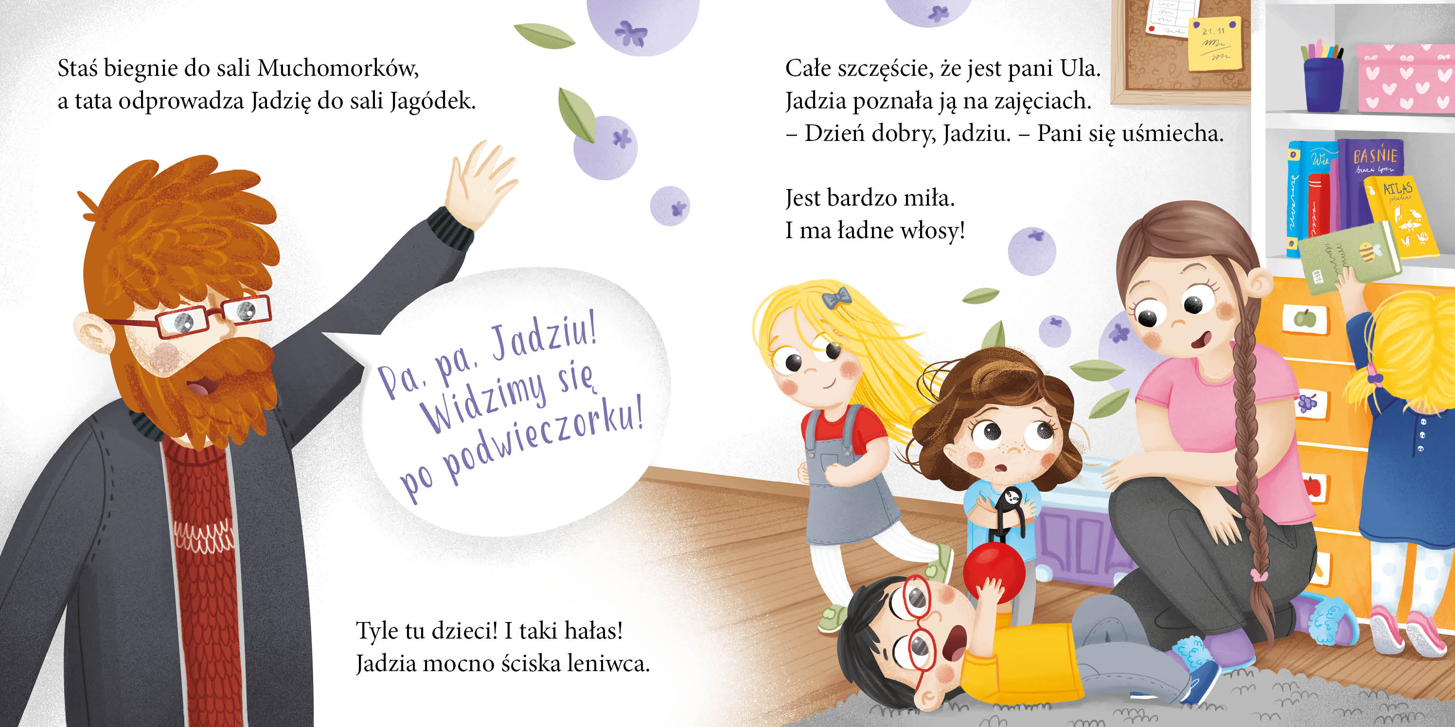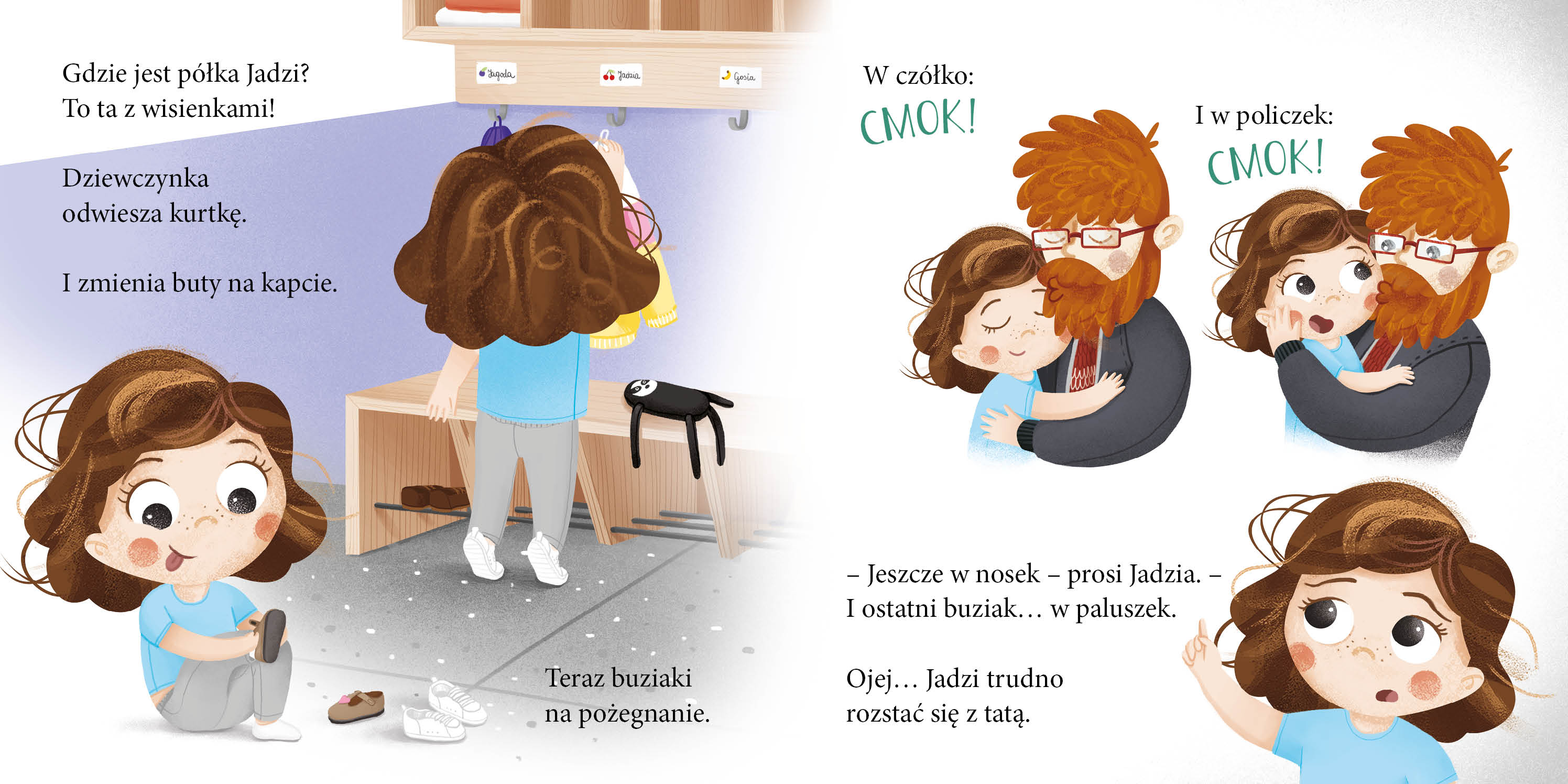Jest poniedziałek. Wyjątkowy poniedziałek. Jadzia Pętelka idzie do przedszkola! To tutaj razem z tatą odprowadzała Stasia. Ale dziś spędzi dzień w grupie Jagódek. Bardzo się cieszy, że czekają na nią nowi przyjaciele i miła pani oraz dużo ciekawych zajęć. Jednak troszkę też się martwi, czy poradzi sobie bez rodziców. Ciekawe, jak to będzie? „Jadzia Pętelka” to seria dedykowana najmłodszym czytelnikom. W każdej części maluchy oraz ich rodzice mają szansę rozpoznać sytuacje z własnej codzienności. Podążając za tytułową bohaterką, odkryją więc sposoby na wyciszenie przed snem, oswoją temat kąpieli, mycia zębów czy siusiania do nocnika, wspólnie przygotują się do wyjścia na spacer. Dzięki prostemu językowi, krótkim tekstom, elementom aktywizującym oraz czytelnym, zabawnym ilustracjom lektura przyciągnie uwagę dziecka i wesprze je w stawianiu czoła maluszkowym wyzwaniom. Warto również poznać Stasia Pętelkę, starszego brata Jadzi – bohatera serii dedykowanej przedszkolakom!