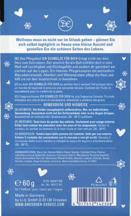 Kąpiel pielęgnacyjna z solą Dresdner Essenz o zmysłowym ,kwiatowym zapachu, która topi lody w sercu, wywołuje szczęście i dobre samopoczucie. Kojąca kąpiel pielęgnacyjna w soli z dodatkiem naturalnych olejków eterycznych z drzewa sandałowego zapewnia odprężenie. W składzie saszetki znajdziemy intensywny kompleks pielęgnujący z olejkiem z orzechów makadamia, alantoiną i białkiem pszenicy, które ochraniają skórę przed wysuszeniem. Kąpiel otula ciepłem, zwłaszcza gdy pogoda na zewnątrz nie rozpieszcza.