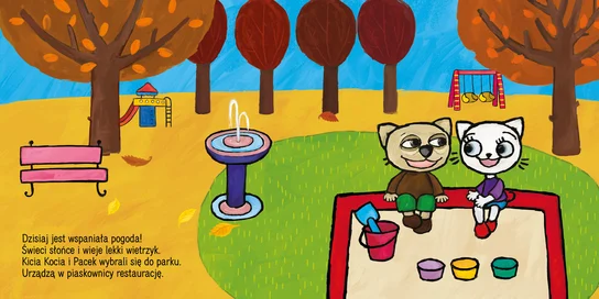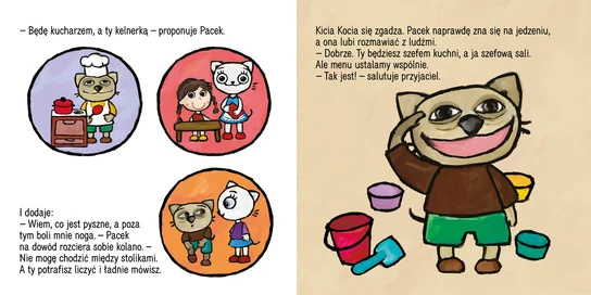 Kicia Kocia i Pacek otwierają w piaskownicy restaurację na niby – będą serwować gościom zupy i desery, i śniadania… Zabawa jest bardzo przyjemna, do czasu gdy między przyjaciółmi dochodzi do wielkiej kłótni o… jajecznicę! Rozgniewane dzieci obrażają się na siebie. Czy to możliwe, że jeszcze kiedyś się pogodzą?