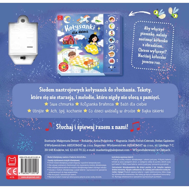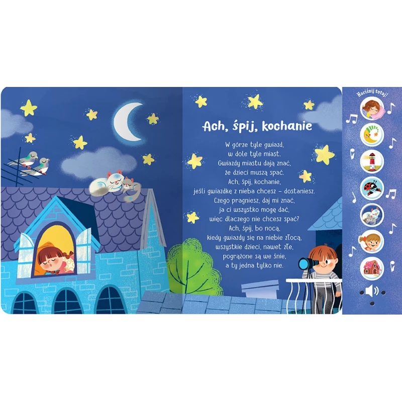 Słuchaj i śpiewaj razem z nami! W książce znajduje się siedem lubianych, odpowiednich dla dzieci kołysanek przekazywanych z pokolenia na pokolenie. Kolorowe ilustracje oraz teksty każdej z piosenek zachęcą dziecko do wspólnego śpiewania. Teksty otoczone są kolorowymi ilustracjami, nawiązującymi do treści piosenek, często je uzupełniają, a co najważniejsze – zachęcają do wspólnej zabawy. Piosenkę można włączyć, naciskając kółeczko z obrazkiem po prawej stronie książki. Jedno kółeczko odpowiada jednej piosence. W każdej chwili można wyłączyć grającą melodię, ponownie naciskając kółeczko. Książka działa na baterie, które można wyjąć i wymienić. Istnieje również możliwość wyłączenia grających piosenek, przesuwając guzik przy baterii. Książka sprawdzi się dla dzieci w każdym wieku. Młodsze mogą tylko słuchać piosenek, starsze dzieci mogą przeczytać tekst i śpiewać równocześnie z nagraniem.