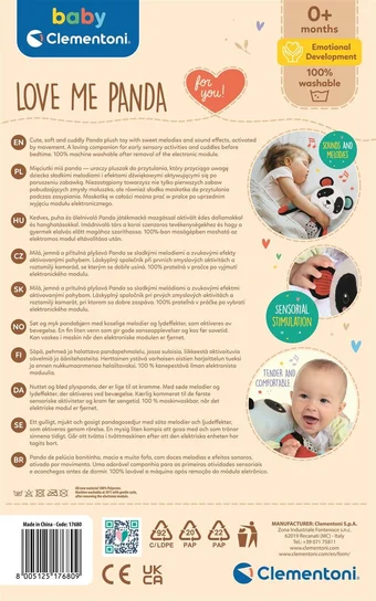 Urocza przytulanka Panda Clementoni to miękka i bezpieczna zabawka stworzona z myślą o najmłodszych. Została zaprojektowana tak, aby rozwijać zmysły dziecka i towarzyszyć mu w pierwszych etapach odkrywania świata. Bezpieczna dla dzieci juz od narodzin. Może być prana w pralce.