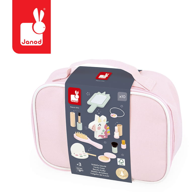 Kosmetyczka z akcesoriami z motywem przewodnim jednorożca francuskiej marki JANOD to doskonała zabawka dla małej modnisi. W skład zestawu wchodzi 10 drewnianych akcesoriów imitujących prawdziwe przybory, m.in. do makijażu: 1 lusterko z rączką, 1 paleta-tęcza z 5 cieniami i pędzelkiem, 1 szminka, 1 lakier do paznokci, 1 tusz do rzęs, 1 puder, 1 duży pędzel, 1 szczotka do włosów, 1 gumka do włosów oraz 1 buteleczka perfum (w kształcie jednorożca). Jasnoróżowa prostokątna kosmetyczka jest zapinana na suwak, ma solidną rączkę do przenoszenia i prezentuje się uroczo. Idealnie nadaje się na prezent.