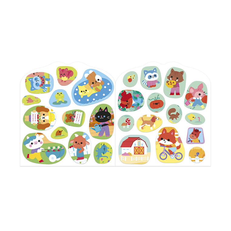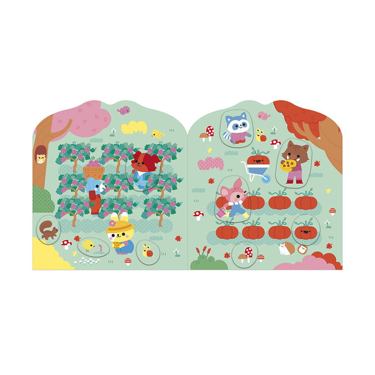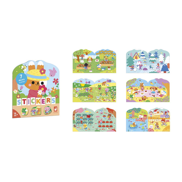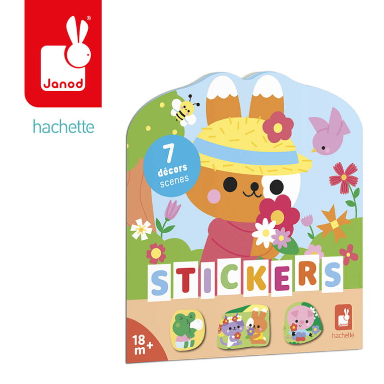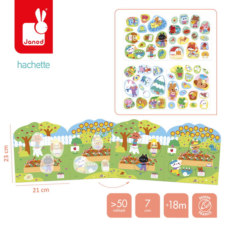 Książeczka do wyklejania z naklejkami Wieś francuskiej marki JANOD. Książeczka zawiera wewnątrz 7 różnych scen z pustymi miejscami do wypełnienia naklejkami. Dziecko może śledzić losy bohaterów opowieści – zwierzątek wypełniających różne przydomowe obowiązki – opowiadać o nich i jednocześnie samodzielnie uzupełniać ilustracje załączonymi do książki naklejkami (ponad 50 szt.).