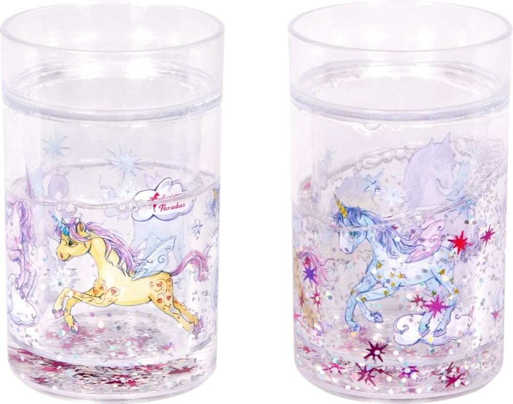 Dziecięcy kubek z podwójnymi ściankami zapewnia nie lada przyjemność z picia, czy jako kubek na szczoteczkę i pastę do zębów w przedszkolu. Przezroczysty kubek ma podwójne ścianki, a wewnątrz poruszają się błyszczące drobinki. Kubek z jednorożcami zachęca dzieci do picia, przyda się także w łazience do płukania zębów, czy w podróży. Podczas nalewania picia do kubeczka dziecko może obserwować jak koniki zanurzają się w napoju.