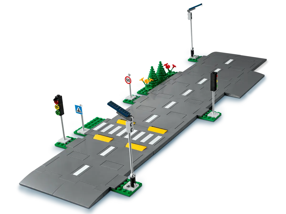 - Co jest w pudełku? Pięć płyt drogowych LEGO® z oznaczeniami pasów, progami zwalniającymi i przejściem dla pieszych, a do tego świecące w ciemności latarnie, zabawkowa sygnalizacja świetlna, znaki drogowe, drzewa i elementy zieleni.