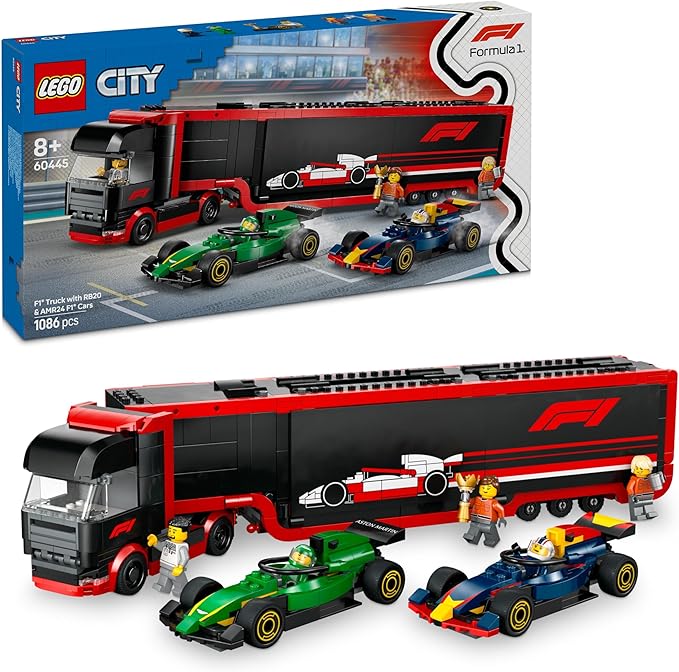 - Zestaw z lawetą LEGO® F1® — młodzi fani Formuły 1® będą zachwyceni tym ekskluzywnym zestawem LEGO City F1® z ciężarówką oraz bolidami F1® RB20 i AMR24 dla dzieci w wieku od ośmiu lat