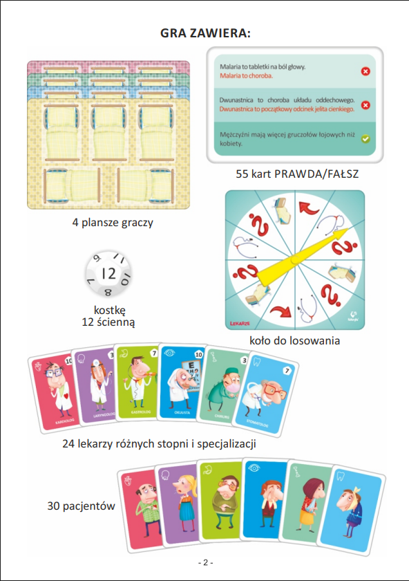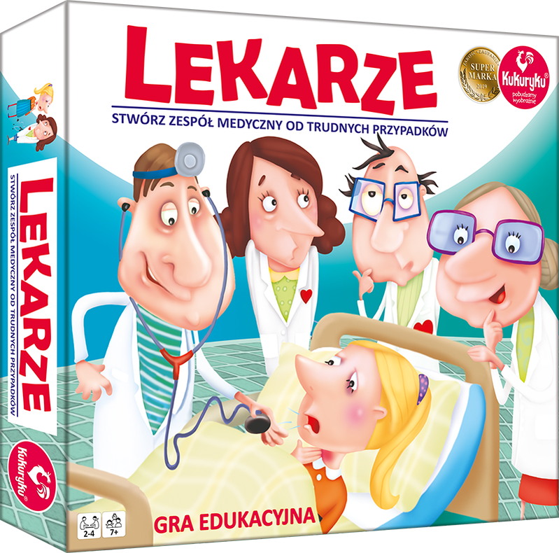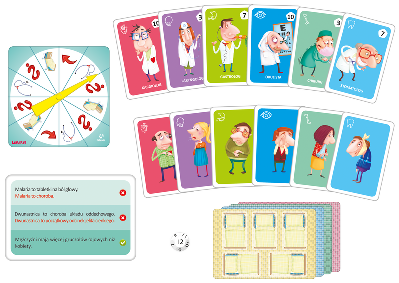 Lekarze to gra edukacyjna, która zapewni rozrywkę i pożyteczną wiedzę z zakresu biologii i ludzkiego ciała tym młodszym, jak i starszym graczom! Rozwiązuj zadania, wykaż się wiedzą i wylecz jak największą ilość pacjentów w swoim szpitalu. Dodatkowym plusem będzie umiejętność zarządzania i strategicznego myślenia godnego dyrektora szpitala. W pudełku znajdziesz karty z pytaniami o różnym poziomie trudności, karty lekarzy różnych specjalizacji oraz karty pacjentów. Chwytaj planszę, zakręć kołem i...na zdrowie!