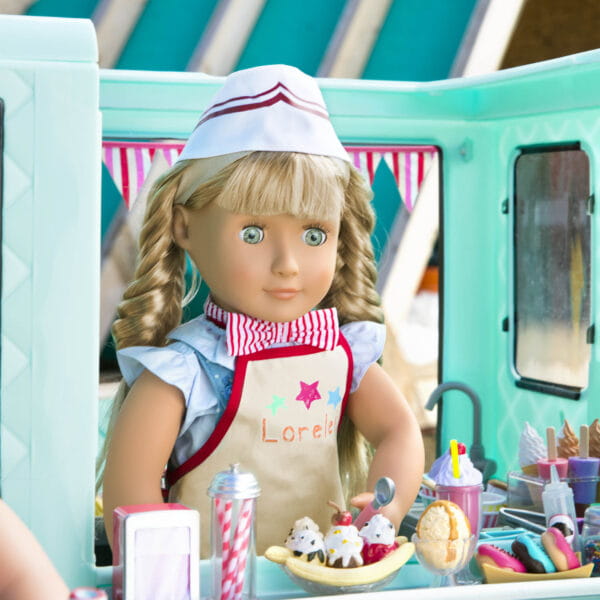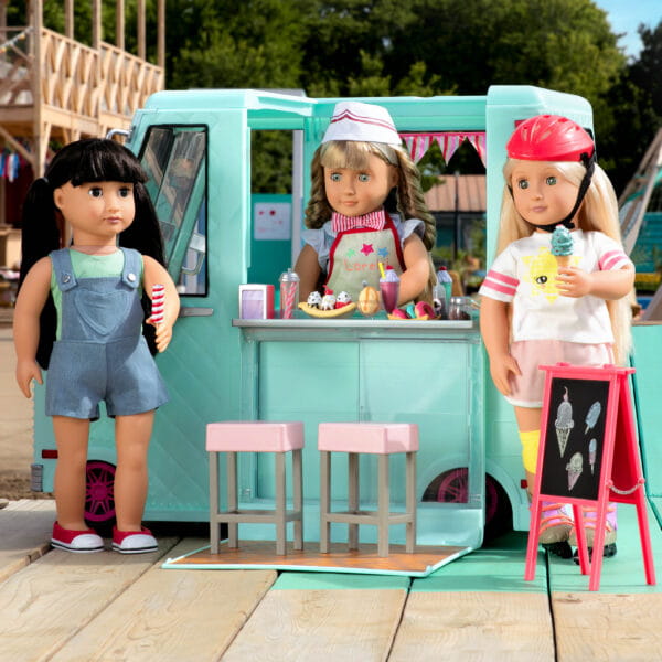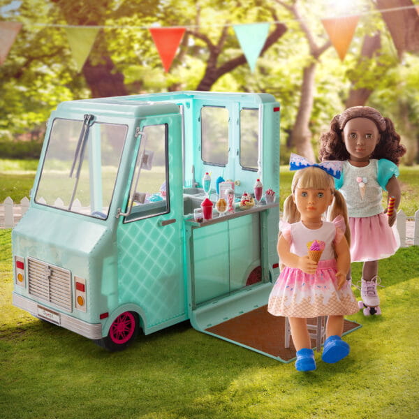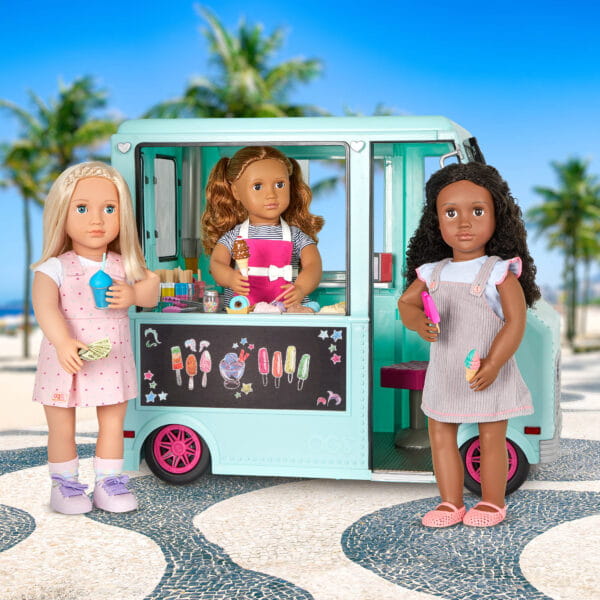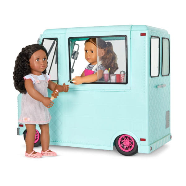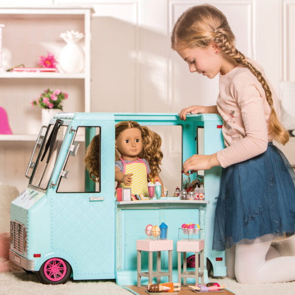 Miętowa ciężarówka z lodami z serii Our Generation to wymarzone centrum zabawy dla każdej małej fanki słodkich przygód! Mobilny punkt sprzedaży lodów z mnóstwem akcesoriów pozwala na tworzenie kreatywnych scenek, zabaw w sprzedawcę, klienta i zarządzanie własnym lodowym biznesem.