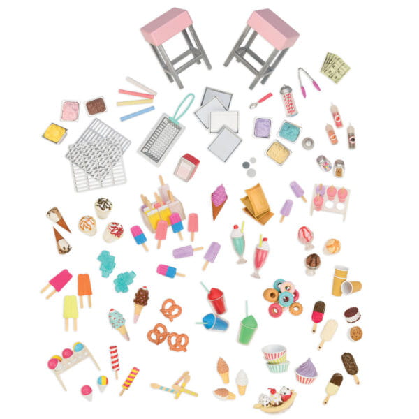 Bogate wyposażenie – zawiera ponad 30 elementów, w tym realistyczne akcesoria: napoje, pucharki lodowe, syropy, sztućce, pieniądze, kredę, dzwonek i wiele więcej.