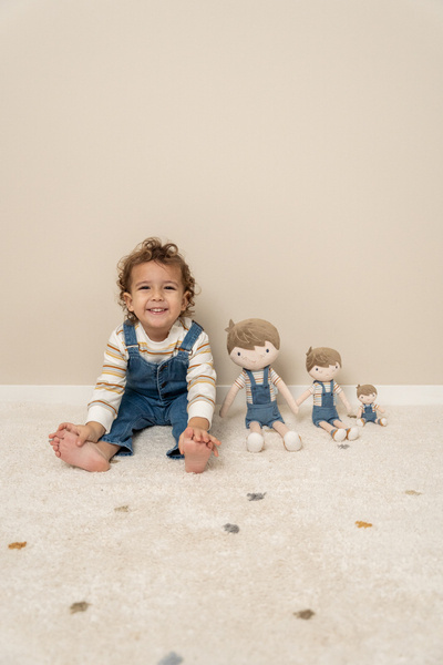 Chłopiec Jim 10 cm od Little Dutch to urocza, malutka przytulanka, wykonana z miłego i miękkiego materiału. Będzie wspaniałym towarzyszem wszystkich zabaw, a dzięki niewielkim rozmiarom można mieć go zawsze przy sobie. Wyglądem przypomina prawdziwego chłopca. Laleczka posiada koszulkę w paski, krótkie spodenki z szelkami w kolorze granatowym z guziczkami oraz musztardowe buciki. Można ją posadzić. Laleczka zapakowana jest w piękne, kartonowe pudełeczko ze sznureczkiem - dlatego idealnie nadaje się na prezent. Do kompletu można dokupić również lalkę Jim w rozmiarze 35 lub 50cm. Będzie stanowić świetne uzupełnienie do pozostałych zabawek z kolekcji Vintage Sunny Stripes.