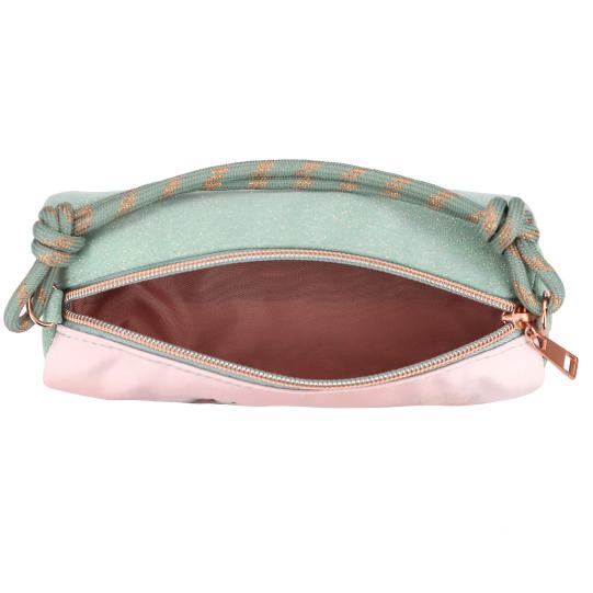 Piórnik w kształcie tuby z kolekcji Miss Melody Romantic Fields to nie tylko piękny dodatek szkolny, ale także praktyczne akcesorium, które wspiera rozwój dziecka. Wykonany w odcieniach szałwiowej zieleni i pudrowego różu, ozdobiony dużym motywem konia na tle porannej łąki, tworzy harmonijną i spokojną kompozycję. Błyszczące wykończenie, elegancki zamek w kolorze różowego złota oraz praktyczny sznurek do przenoszenia sprawiają, że piórnik jest zarówno funkcjonalny, jak i wyjątkowy wizualnie.