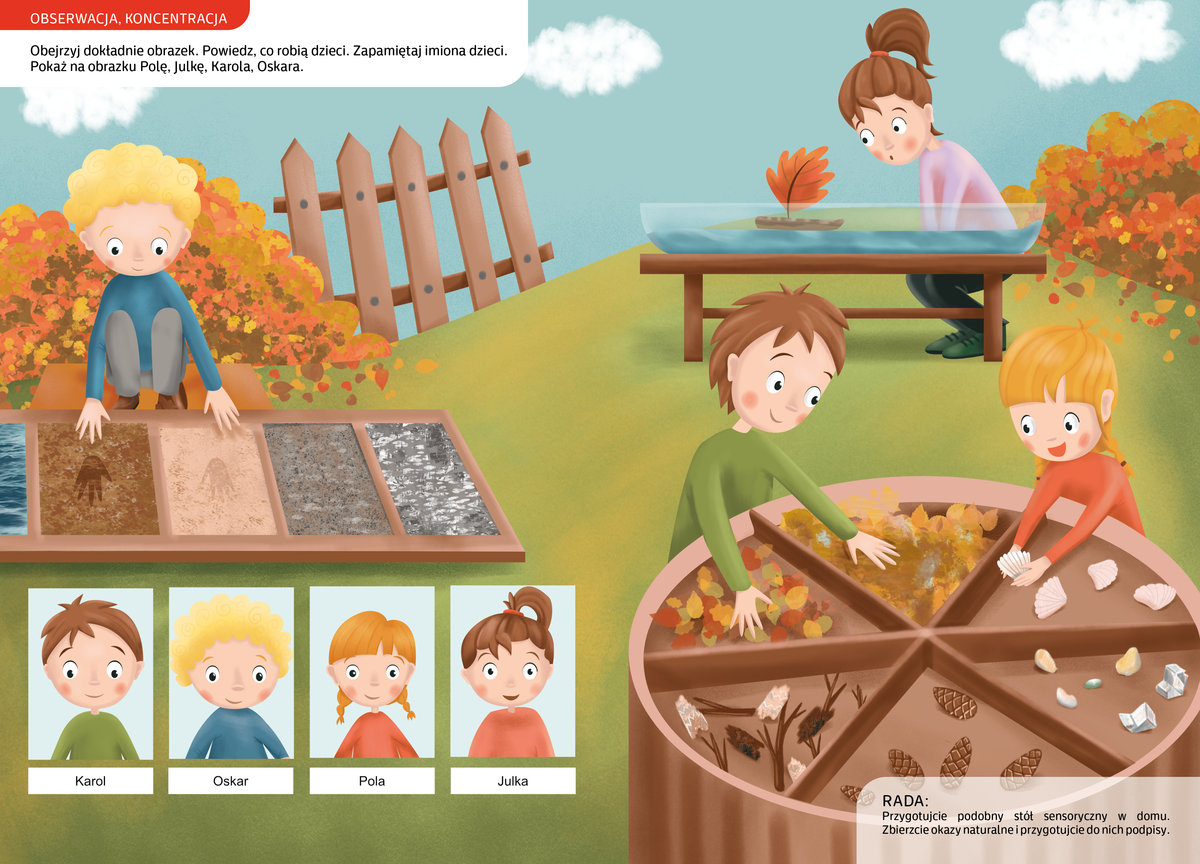 Układ książki wymaga, by dziecku towarzyszyła osoba dorosła, która odczytuje polecenia, wyjaśnia sposób wykonania zadań, służy pomocą, zachęca do ukończenia pracy. Dziecko staje się współtwórcą książki, a to stwarza doskonałą okazję do licznych rozmów, wypowiadania się na temat wykonywanych ćwiczeń, oceny pracy, dzielenia się własnymi spostrzeżeniami.