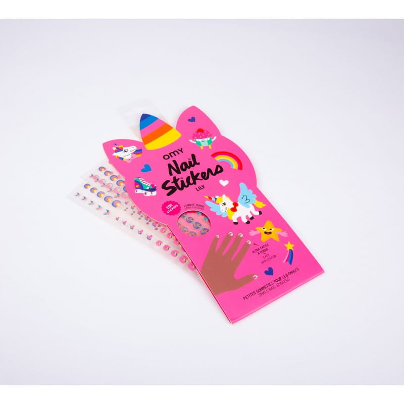 Bajkowe naklejki na paznokcie omy udekorują paluszki dziewczynki. Spośród 200 naklejek można wybrać wzory z jednorożcem, tęczą, serduszkami, okularami przeciwsłonecznymi, donutami, czy wrotkami. Mogą być przyklejane na lakier lub bezpośrednio na płytkę paznokcia. Wesołe naklejki na paznokcie są całkowicie bezpieczne, nietoksyczne, łatwe do przyklejenia i usunięcia. Naklejki te utrzymują się przez co najmniej 1 do 2 dni i nie odklejają się podczas mycia rąk.