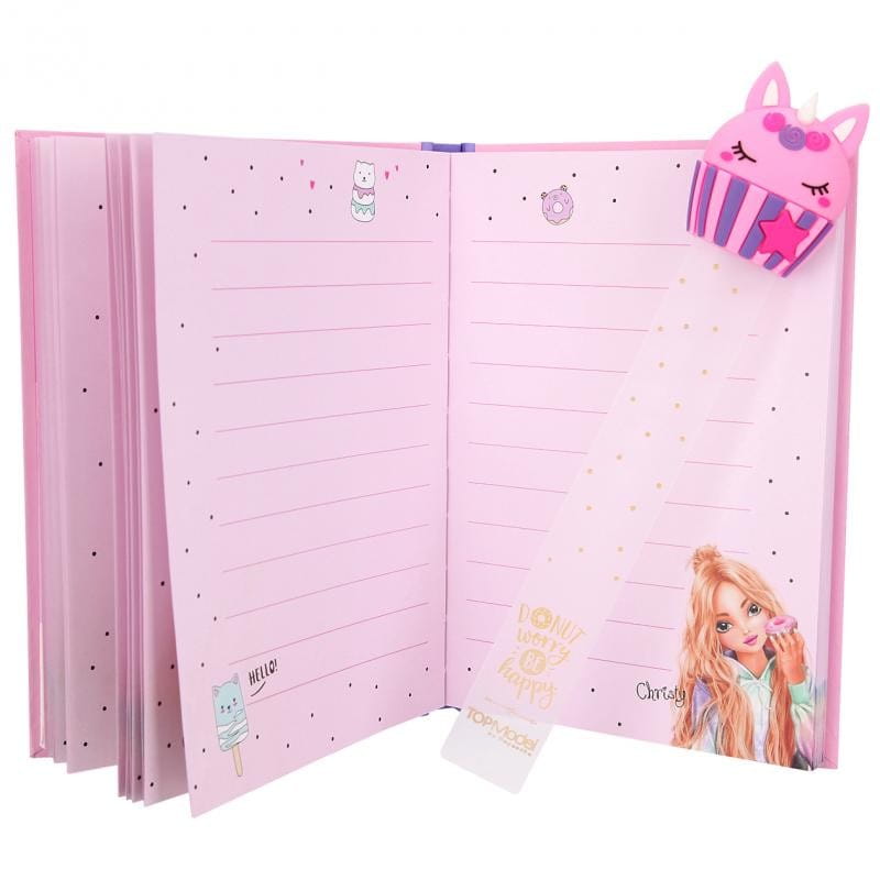 Kieszonkowy notes z grubą okładką kryje wewnątrz arkusz słodkich naklejek oraz zakładkę z gumową muffinką. Notes Top Model posiada fioletowe strony w linie oraz grafikę z lodami i pączkami z dziurką. Notes wielkości A5 można mieć zawsze pod ręką i przy sobie, gdy do głowy wpadnie myśl do zapisania.