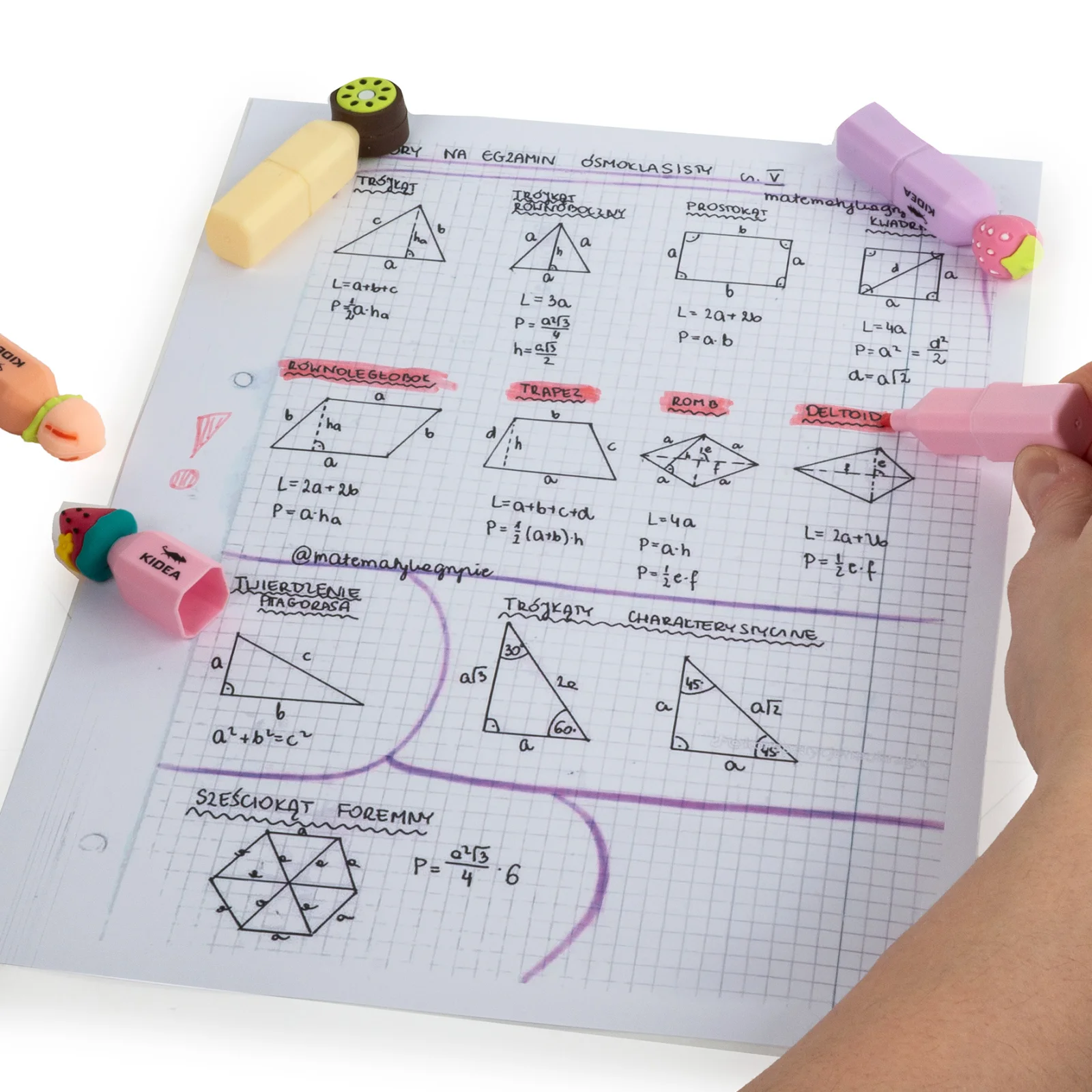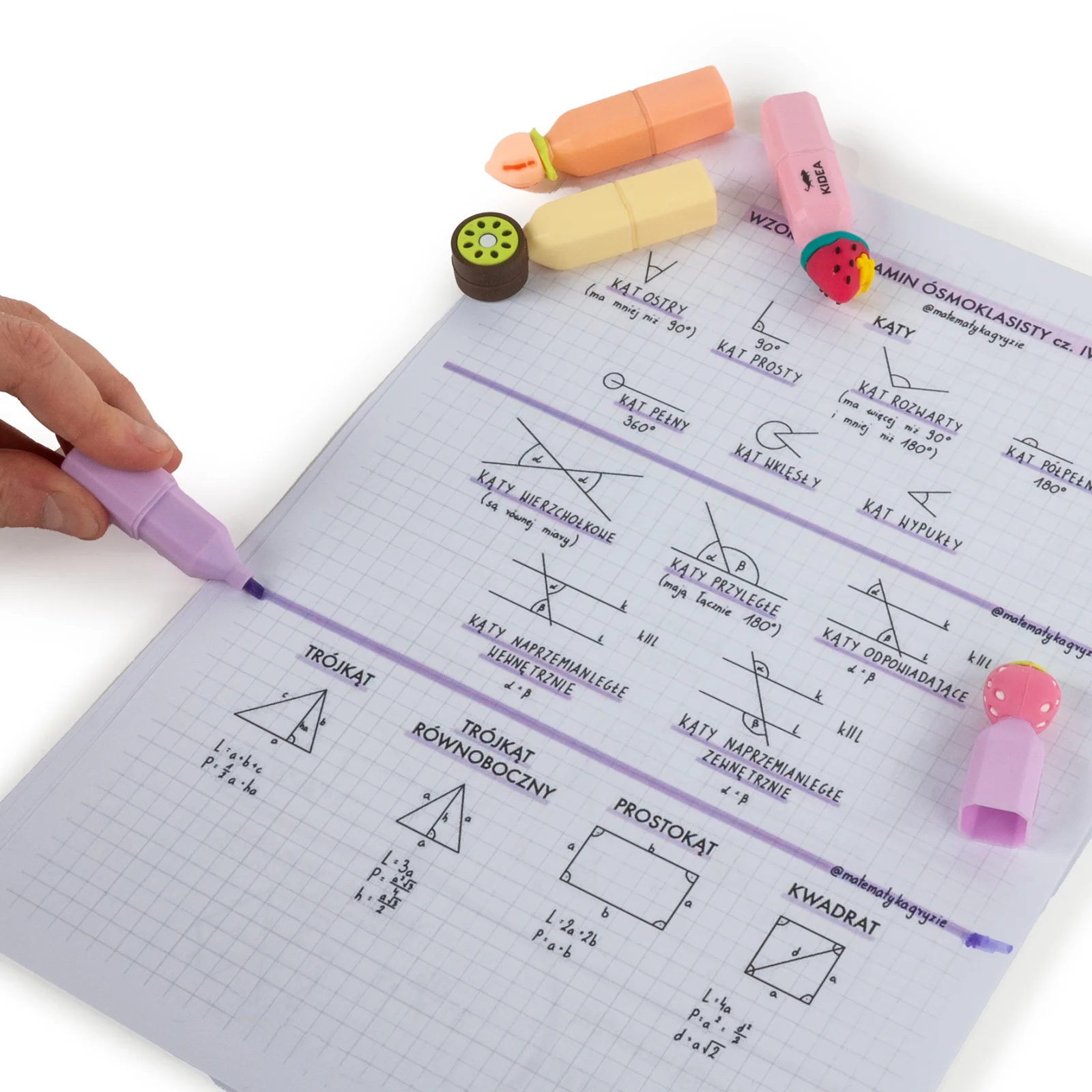 Każdy zakreślacz posiada ozdobną zatyczkę w kształcie owocu, co nadaje zestawowi wyjątkowy, zabawny charakter. W komplecie znajdują się kolory: fioletowy (truskawka), różowy (arbuz), pomarańczowy (brzoskwinia) oraz żółty (kiwi). To świetny wybór dla uczniów, studentów oraz wszystkich, którzy lubią estetyczne i praktyczne akcesoria biurowe.