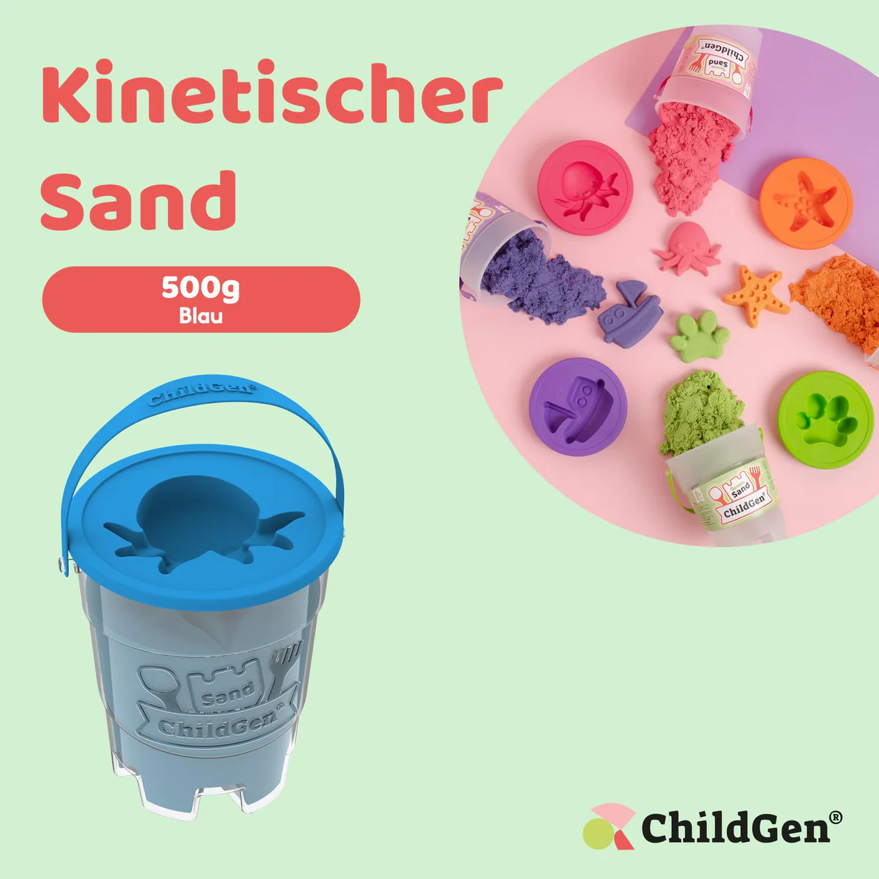 Dostępny w pięciu kolorach: naturalnym, zielonym, żółtym, fioletowym, niebieskim, pomarańczowym i różowym – piasek kinetyczny ChildGen to wyjątkowa zabawa bez bałaganu.