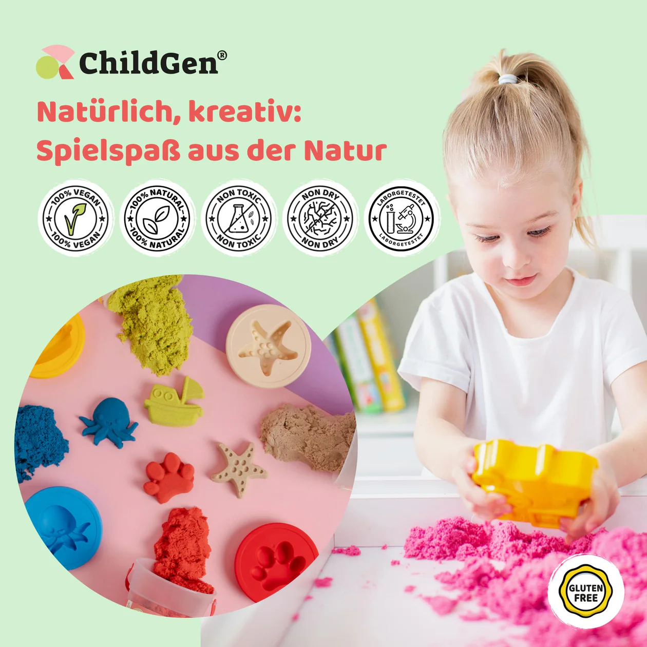 Dostępny w pięciu kolorach: naturalnym, zielonym, żółtym, fioletowym, niebieskim, pomarańczowym i różowym – piasek kinetyczny ChildGen to wyjątkowa zabawa bez bałaganu.