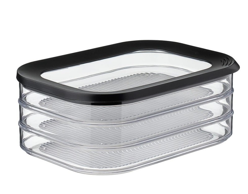 Nowoczesny i praktyczny pojemnik na jedzenie holenderskiej marki Mepal. Przezroczysta pokrywa umożliwia kontrolowanie zawartości bez potrzeby otwierania. Pojemnik składa się z 3 części o wysokości 2,5 cm a trzy poziomy pozwalają zaoszczędzić i zagospodarować miejsce w lodówce.