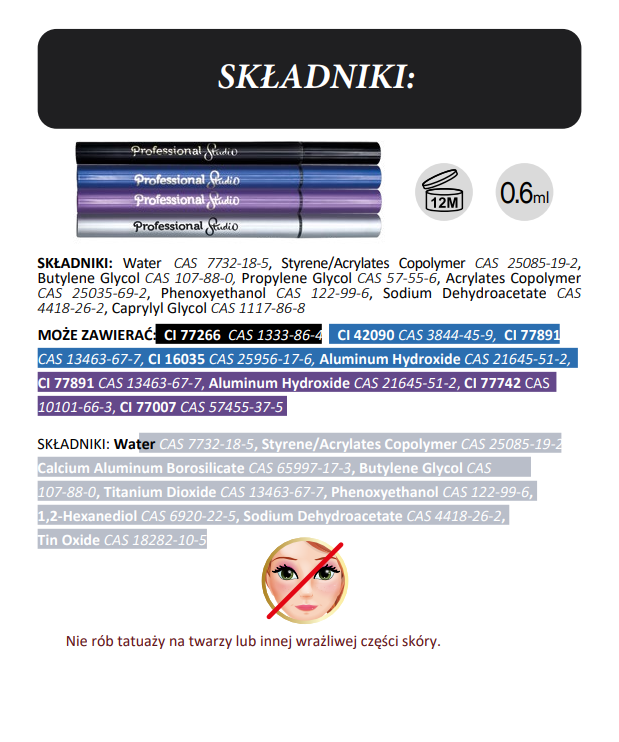 W zestawie znajdują się markery koloru srebrnego, czarnego, granatowego i fioletowego. Tusz jest zmywalny po kilku dniach. Wystarczy użyć mydła lub płynu do demakijażu, w zależności od typu skóry. Nie należy malować markerami lub używać wzorów na twarzy lub innych wrażliwych miejscach na skórze.