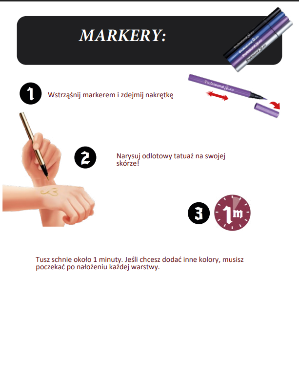 - 4 markery do tworzenia tatuaży (czarny, srebrny, fioletowy i granatowy),