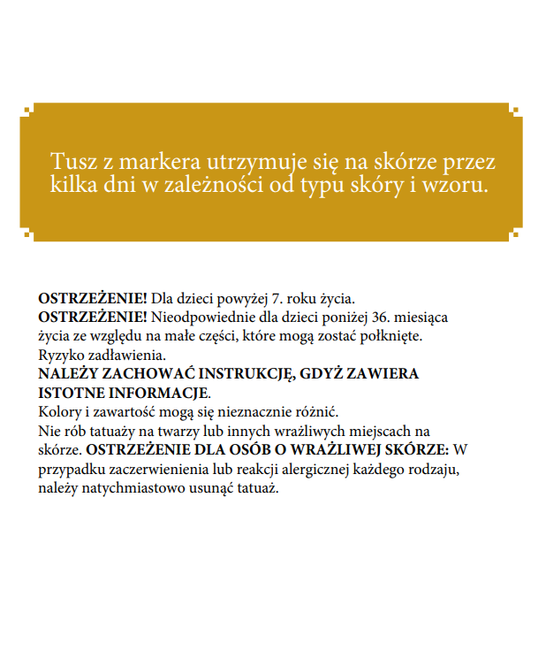 Zadanie jest proste: wybierz kolor pisaka i narysuj wymyślony przez siebie tatuaż bezpośrednio na skórze lub wybierz jeden wzór z załączonego arkusza, odbij go na skórze i pokoloruj. Właściwie używane wzory są wielokrotnego użytku.