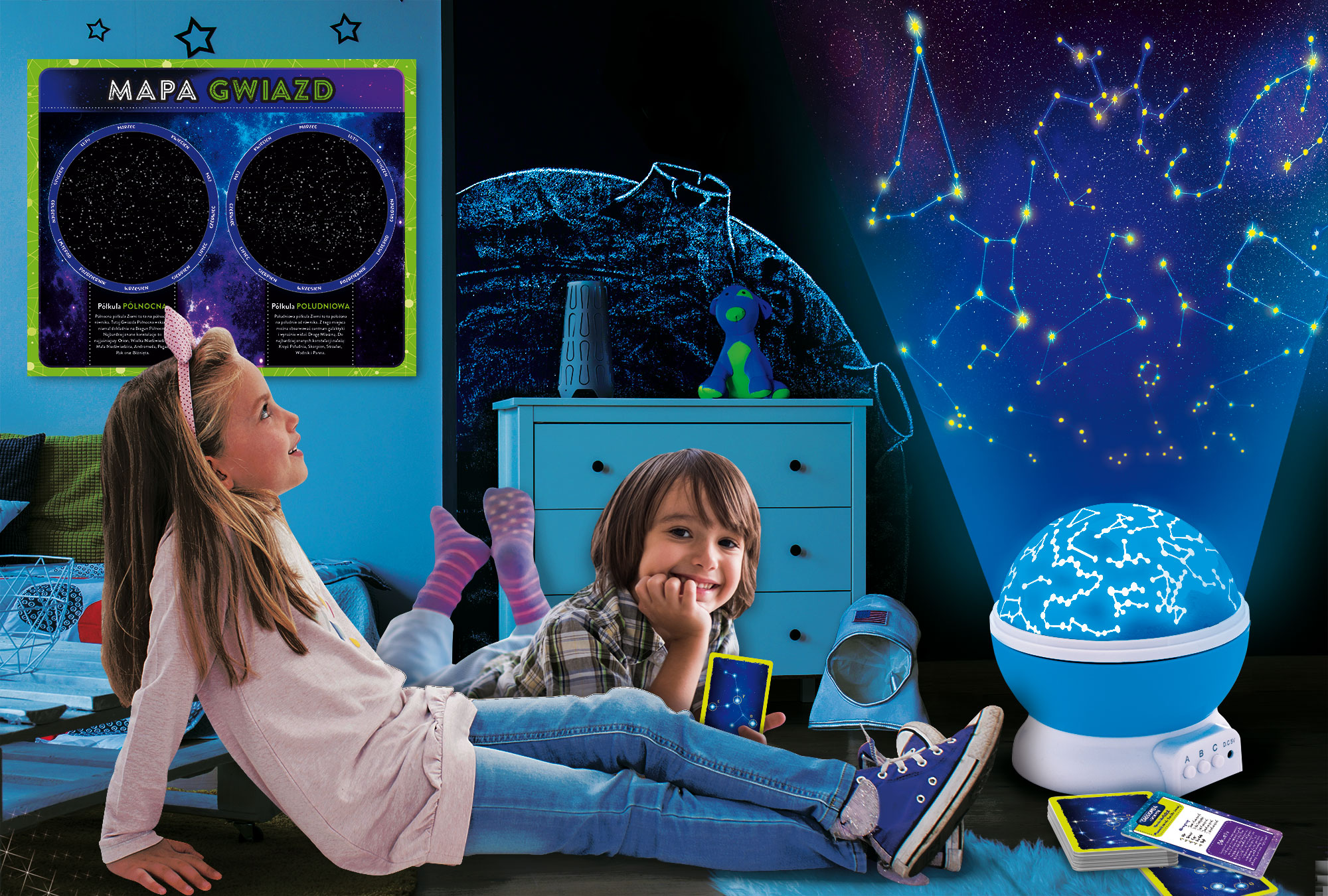 Dołączony plakat z mapą gwiazd, karty gwiazdozbiorów oraz ilustrowany podręcznik pomogą poznać niebo i zrozumieć jego sekrety. Zestaw zawiera również kabel USB do zasilania projektora.
