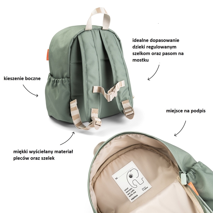 Dzięki miękkim, wyściełanym plecom i regulowanym szelkom dostosowanym do małych ramion, jest wygodny do noszenia przez cały dzień. Plecak posiada dużą główna kieszeń, przednią kieszeń na przekąski do szybkiego chwycenia, a także dwie boczne kieszenie idealne na małe butelkę lub bidon. Plecak wykonany jest z trwałego, wodoodpornego materiału, który wytrzymuje codzienne małe i duże niespodzianki.