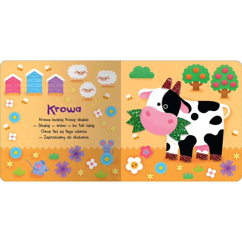Format: 17,5 x 17,5 cm; karton, brokatowe wystające wstawki do dotykania, ilustracje barwne