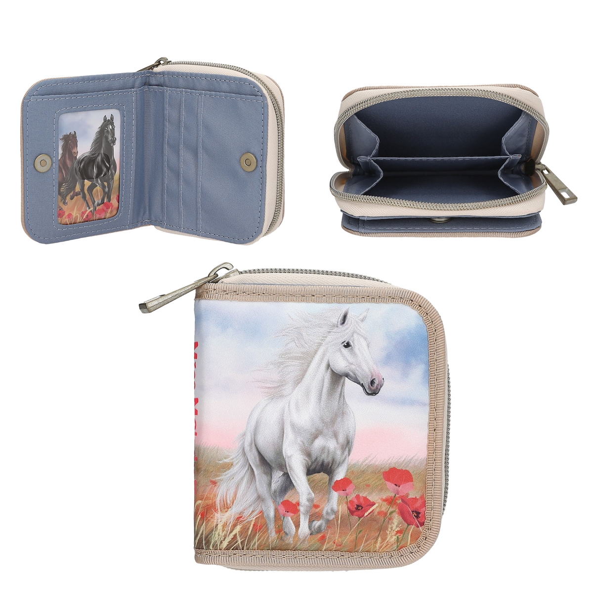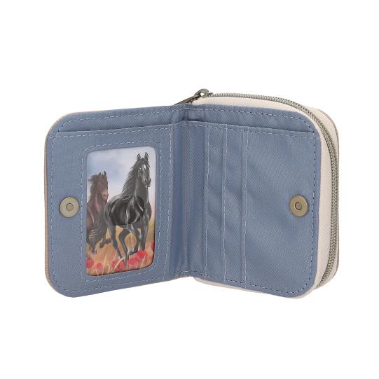 Elegancja i miłość do koni w jednym! Portfel POPPY SAND z kolekcji Miss Melody zachwyca subtelnym, beżowym kolorem i pięknym motywem białego konia galopującego po polu pełnym czerwonych maków. To nie tylko praktyczny dodatek, ale też stylowy element, który spodoba się wszystkim młodym miłośniczkom koni.