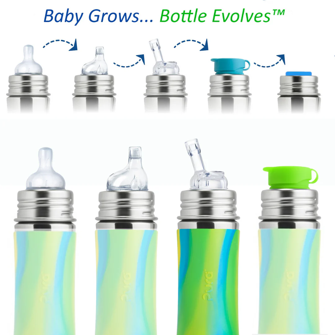 Rośnie razem z dzieckiem: dzięki wymiennym końcówkom butelka może pełnić rolę butelki dla niemowląt, butelki ze słomką czy bidonu sportowego – wystarczy zmienić ustnik.