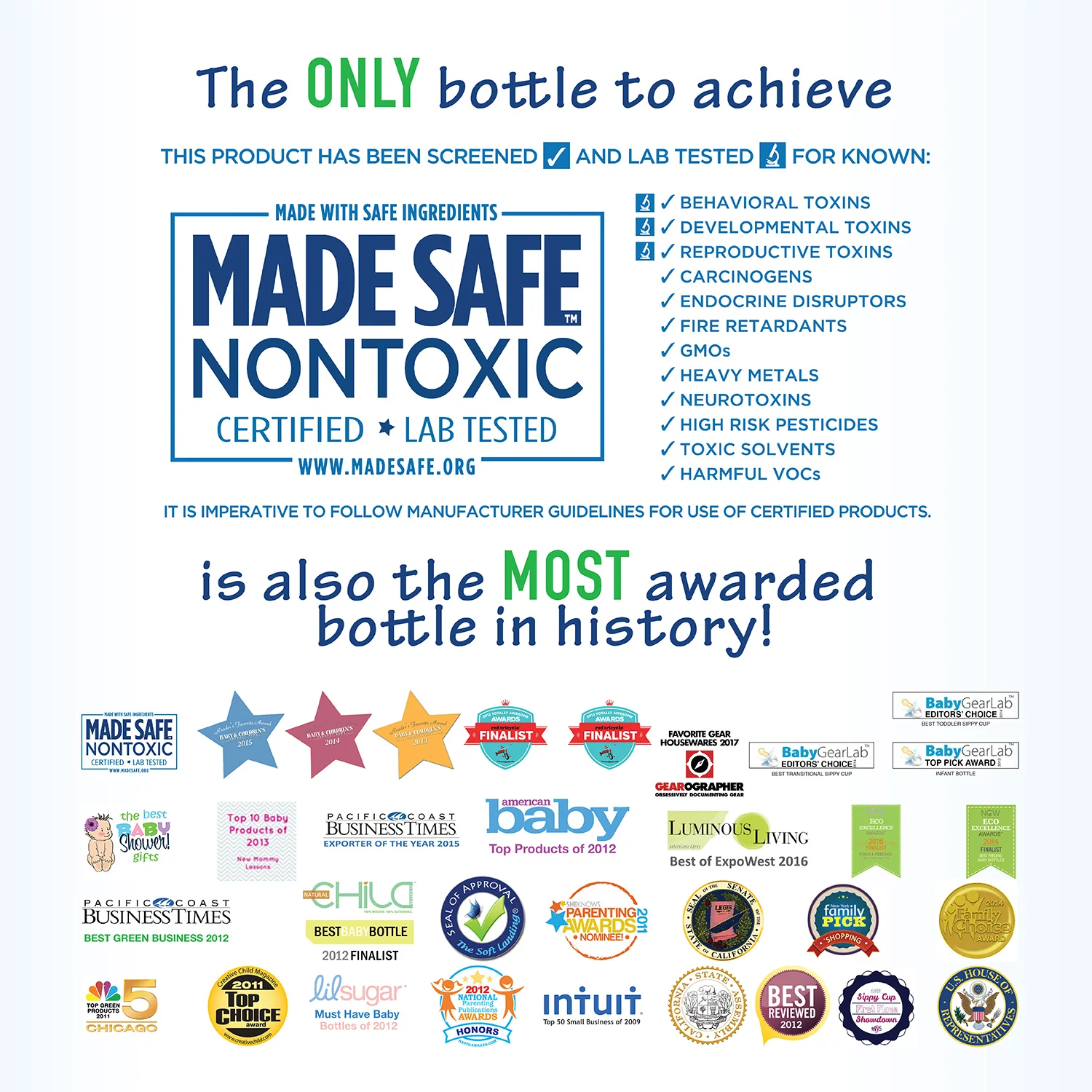 Bezpieczna: jedyna na rynku butelka niekapek w 100% wolna od plastiku, wykonana wyłącznie ze stali nierdzewnej; jedyna butelka z certyfikatem Made Safe®.