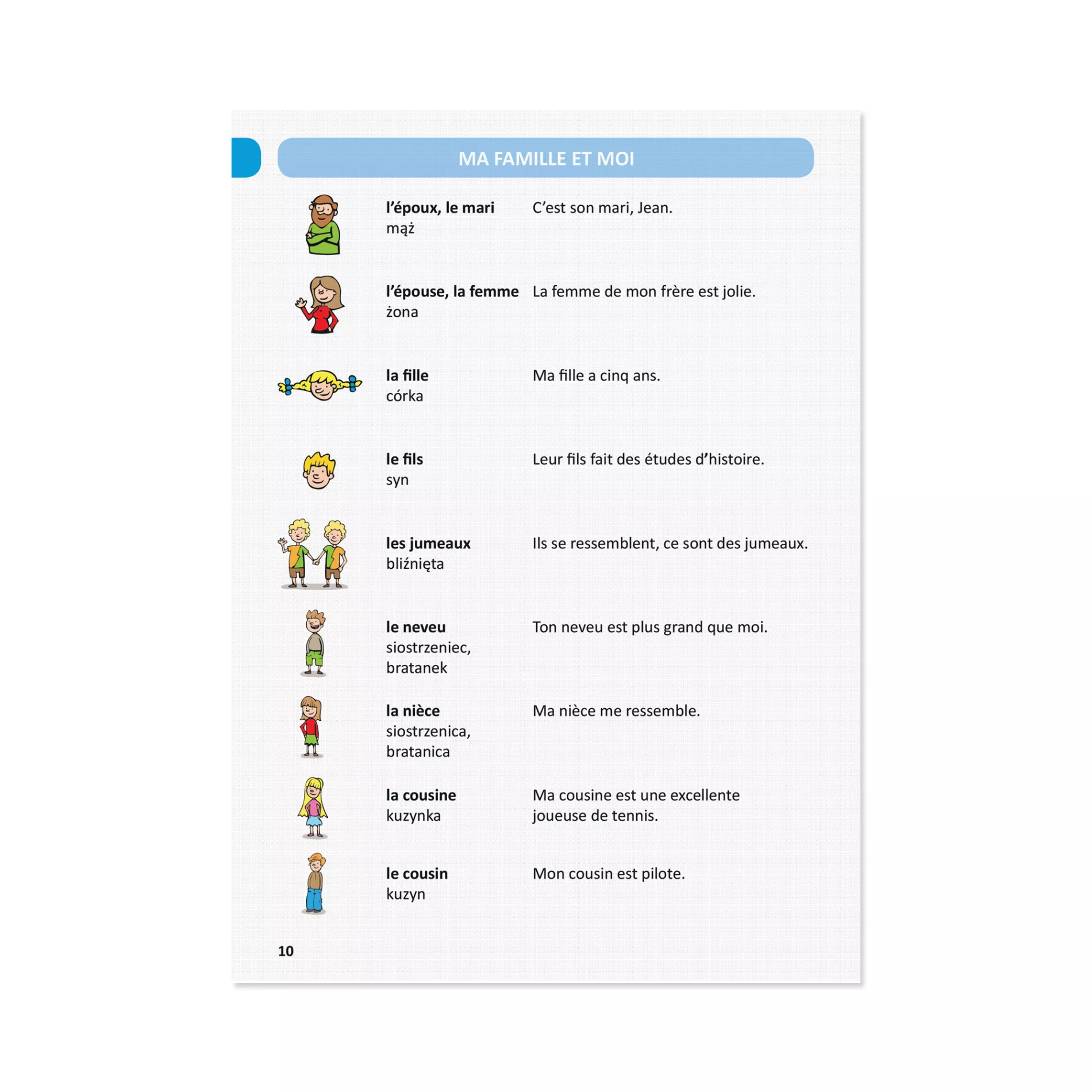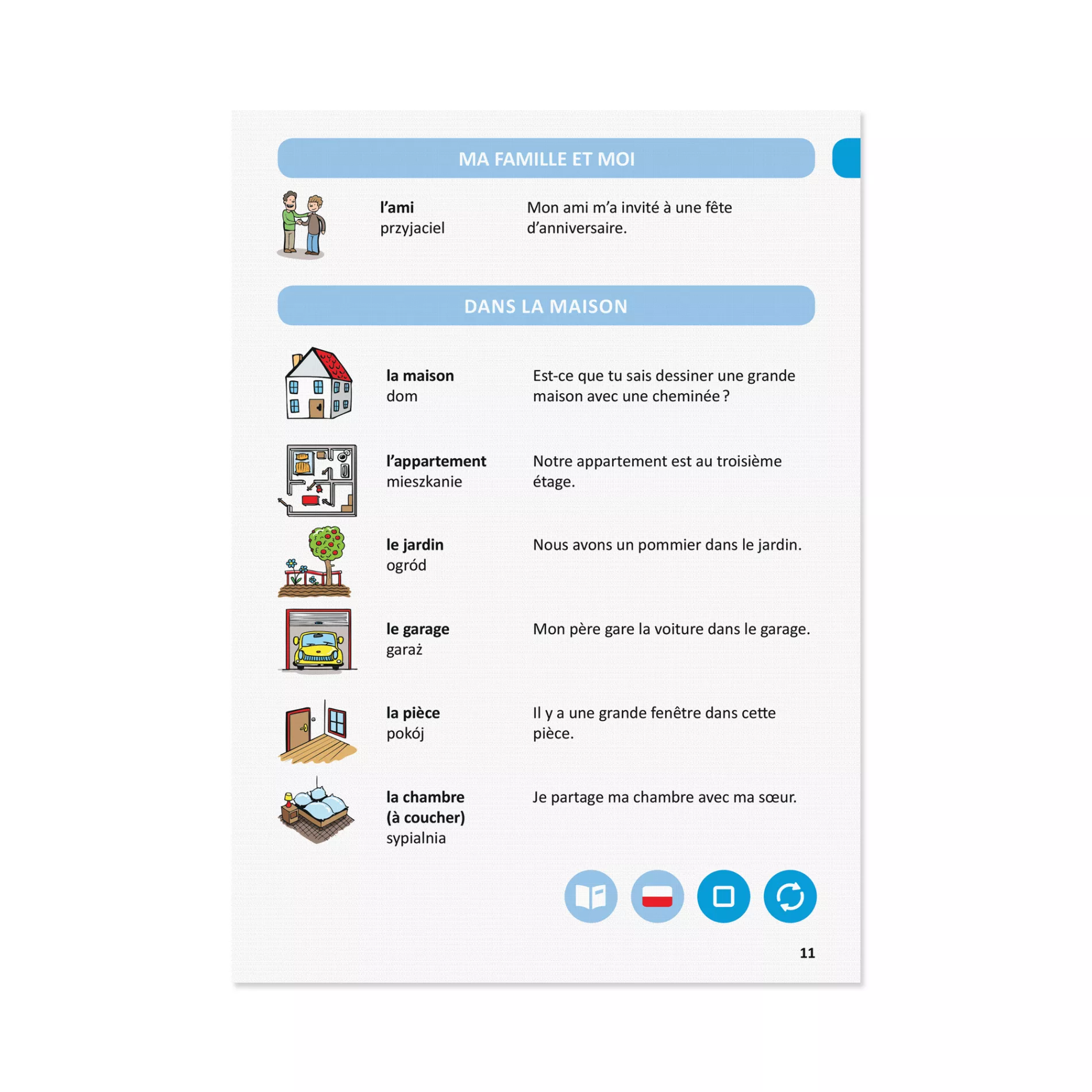 Słowa są przedstawione za pomocą obrazków, aby można było je łatwiej zapamiętać. Prawidłowej wymowy uczą native speakerzy, a zawarte w słowniku quizy – bez polskiego tłumaczenia – sprawdzają zdobytą wiedzę. Na każdej stronie znajdują się dwie wersje językowe – polska i francuska.