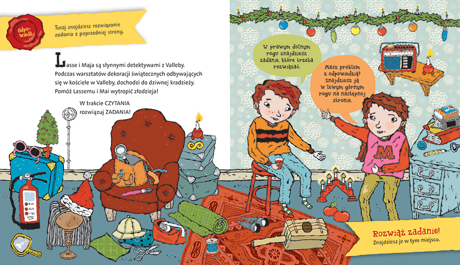 Wyjaśnij wraz z Lassem i Mają tajemnicze zniknięcie! Odczytaj zaszyfrowane wiadomości, wypatrz szczegóły, napraw świąteczną ozdobę, przeszukaj kieszenie podejrzanych, znajdź kredki, złap małpkę i pomóż mieszkańcom Valleby dokończyć szopkę!