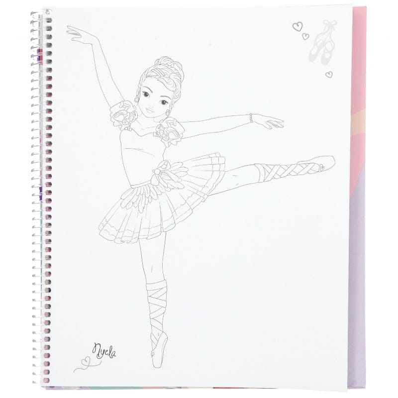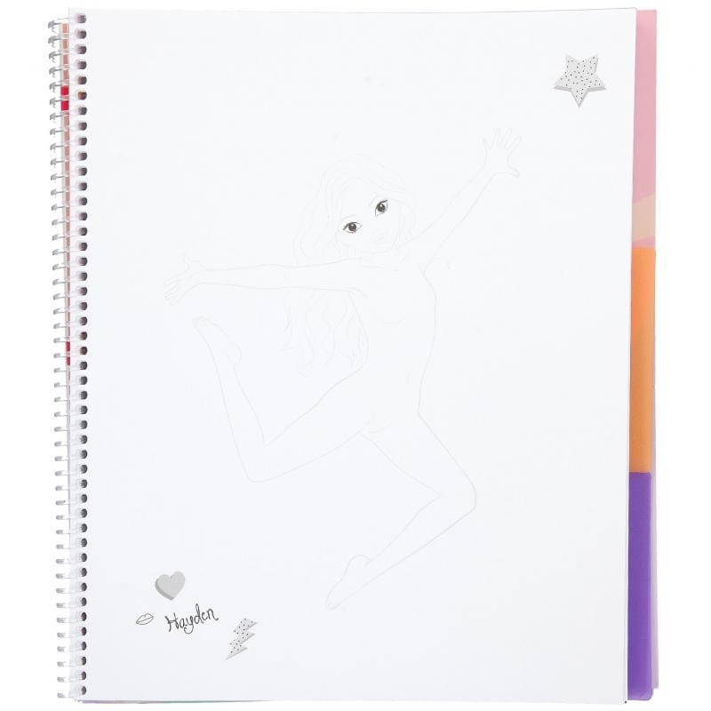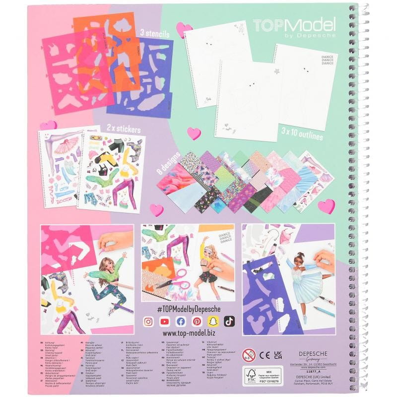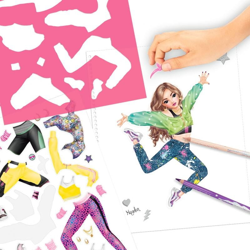 Kreatywny notes, a w nim bogaty szkicownik do projektowania ubrań TopModel Dance. Ten zestaw będzie spełnieniem marzeń młodej projektantki mody. Wewnątrz mamy naszkicowane sylwetki tancerek, naklejki z garderobą taneczną i butami, szablon do odrysowywania części ubrań w różnych stylach tańca, które wycina się ze specjalnych kartek ze wzorami tkanin i przykleja do sylwetki tancerki.