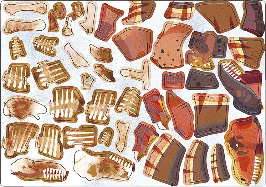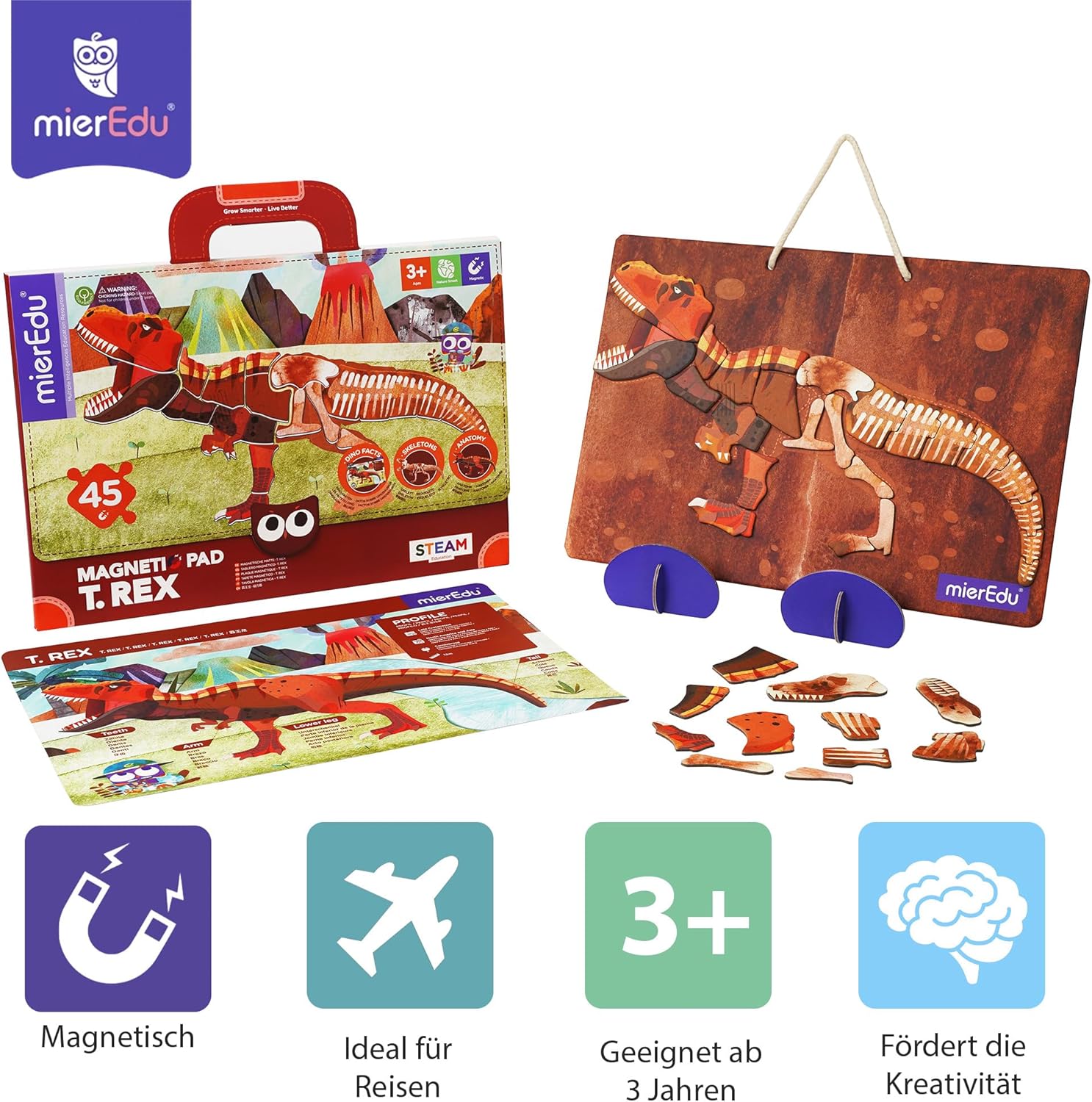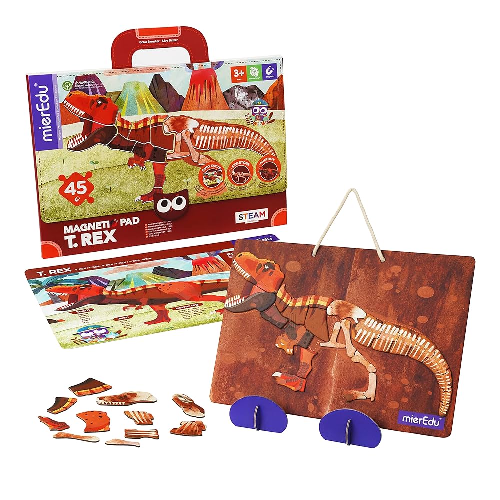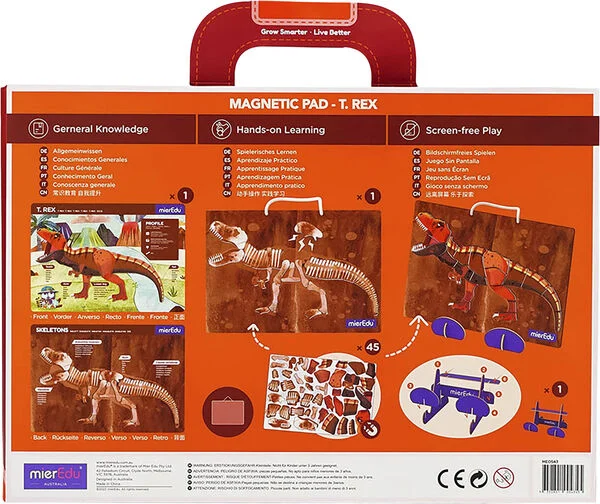Zestaw zawiera magnetyczną układankę przedstawiającą zarówno „wersję z kośćmi”, jak i wygląd T-Rexa z zewnątrz. Dodatkowa karta anatomiczna pozwala dziecku poszerzać wiedzę i odkrywać, jak zbudowany był jeden z najbardziej znanych dinozaurów.