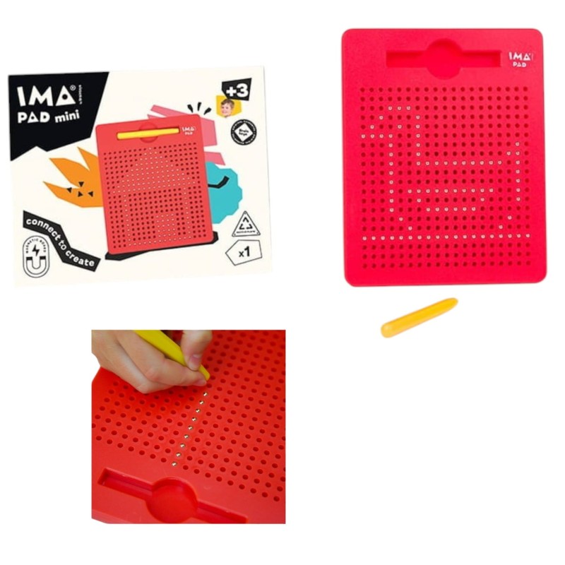 Tablica magnetyczna Imapad MINI to idealny sposób na nudę! Za pomocą dołączonego, magnetycznego rysika dzieci "rysują" obrazki. Tablica posiada dziurki, z których wydobywa się magnetyczne kuleczki, które razem tworzą wybrane dzieło. Zabawka jest w pełni bezpieczna: otwory są na tyle duże, aby kuleczka była widoczna, ale na tyle małe, aby nie miała możliwości wypaść.