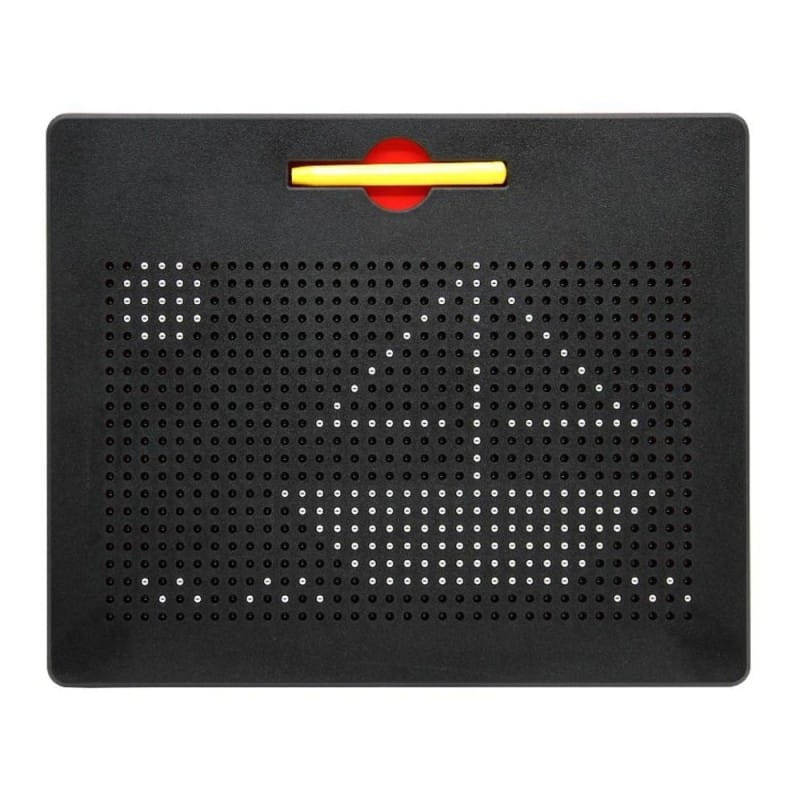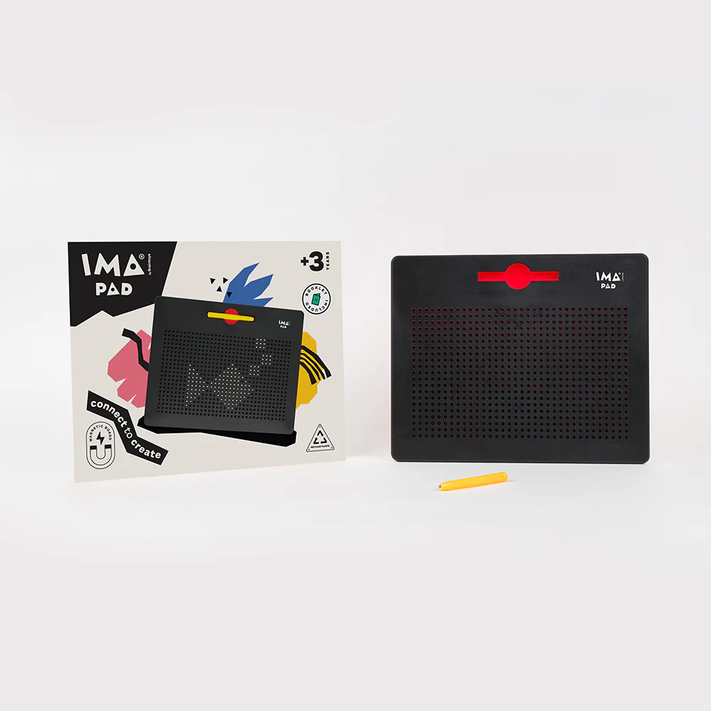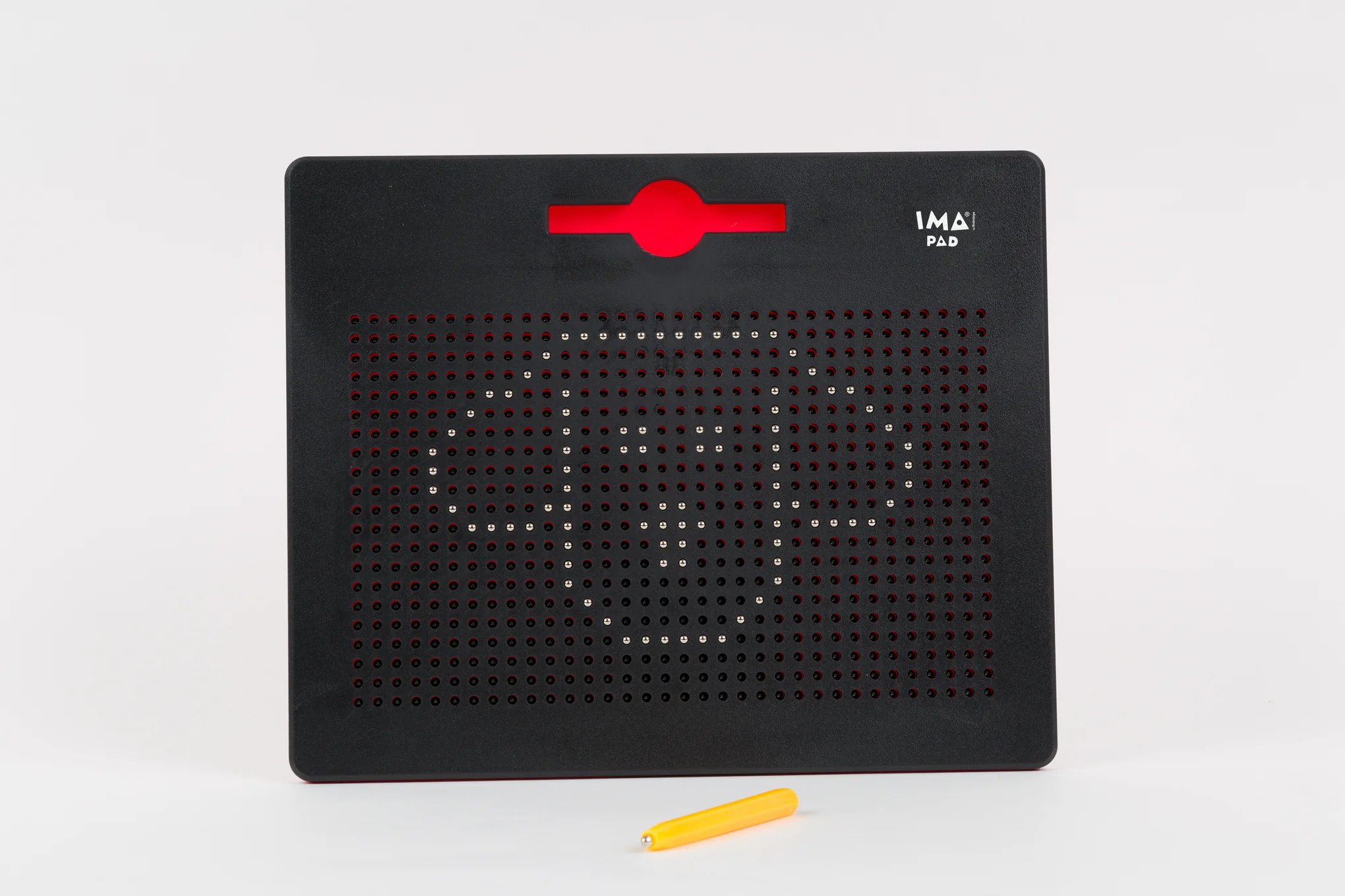Tablica magnetyczna Imapad to idealny sposób na nudę! Za pomocą dołączonego, magnetycznego rysika dzieci "rysują" obrazki. Tablica posiada dziurki, z których wydobywa się magnetyczne kuleczki, które razem tworzą wybrane dzieło. Zabawka jest w pełni bezpieczna: otwory są na tyle duże, aby kuleczka była widoczna, ale na tyle małe, aby nie miała możliwości wypaść.