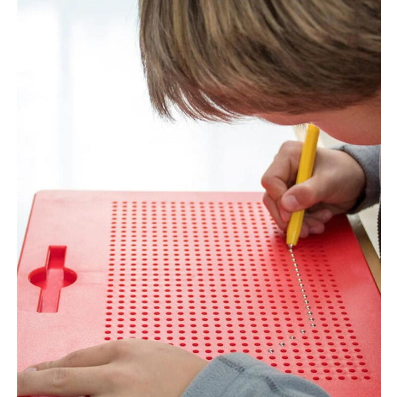 Tablica magnetyczna Imapad to idealny sposób na nudę! Za pomocą dołączonego, magnetycznego rysika dzieci "rysują" obrazki. Tablica posiada dziurki, z których wydobywa się magnetyczne kuleczki, które razem tworzą wybrane dzieło. Zabawka jest w pełni bezpieczna: otwory są na tyle duże, aby kuleczka była widoczna, ale na tyle małe, aby nie miała możliwości wypaść.