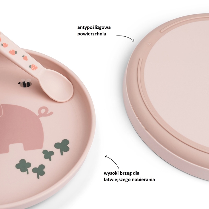 Na różowym talerzu nadrukowany jest uroczy motyw wesołej świnki Pigee, zajadającej się truskawkami. Pozwól dziecku przyłączyć się do zabawy i szukać nowych wrażeń podczas posiłku.
