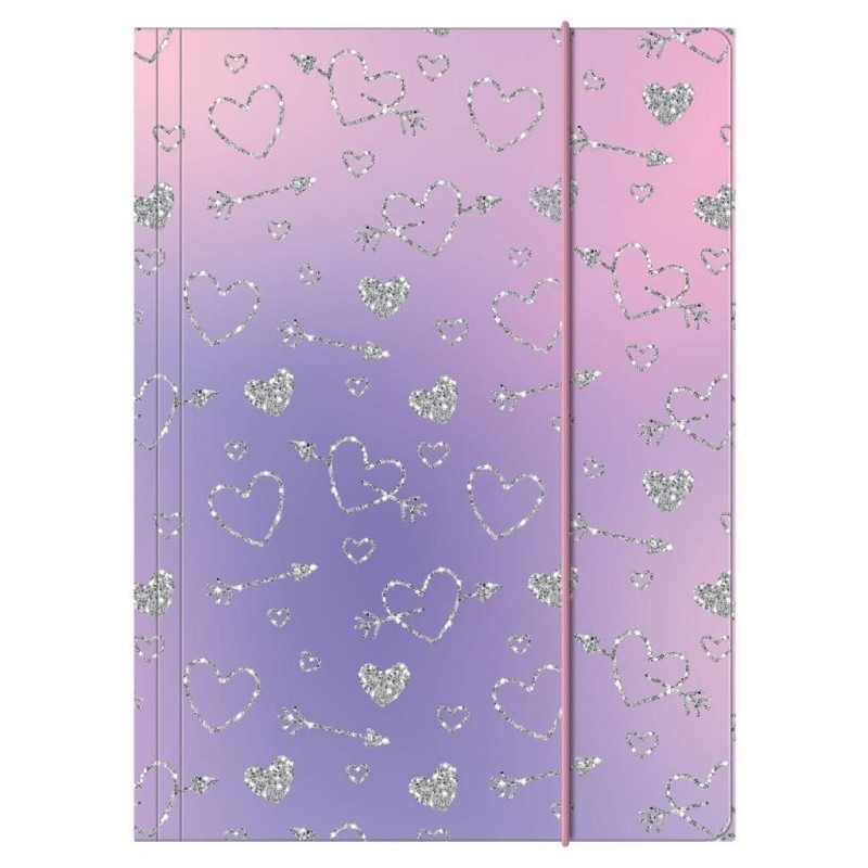Teczka o intensywnych fioletowych i różowych odcieniach, które płynnie przechodzą jeden w drugi, tworząc efektowny gradient kolorów. Na tle tych pięknych barw wyróżniają się srebrne, świecące serduszka z dynamicznymi strzałami. To połączenie nowoczesnego designu, romantyzmu i energii.