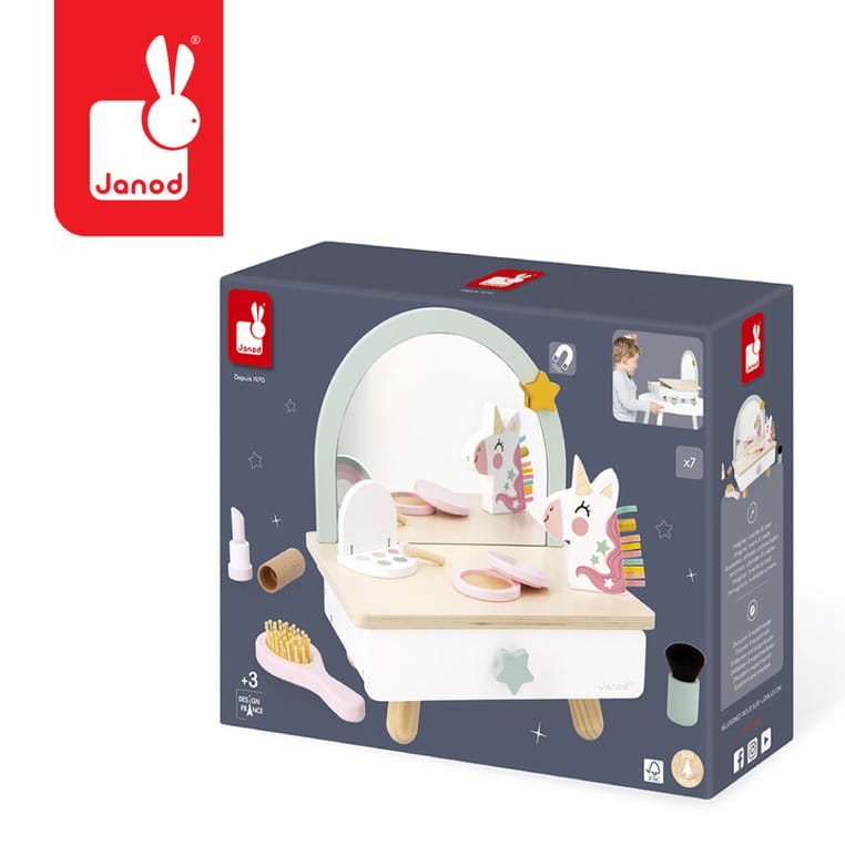 Mała toaletka z 7 akcesoriami z motywem przewodnim jednorożca francuskiej marki JANOD to doskonała zabawka dla małej modnisi. W skład zestawu wchodzi toaletka z lustrem i szufladą oraz 7 drewnianych akcesoriów imitujących prawdziwe przybory, m.in. do makijażu:: 1 paleta-tęcza z 5 cieniami i pędzelkiem, 1 szminka, 1 puder, 1 duży pędzel, 1 szczotka do włosów, 1 buteleczka perfum (w kształcie jednorożca) oraz magnes-gwiazdka, dzięki któremu można przyczepić coś do ramy lustra, np. rysunek czy notatkę. Zabawka może stanowić urocze uzupełnienie dziecięcego pokoju. Idealnie nadaje się na prezent.